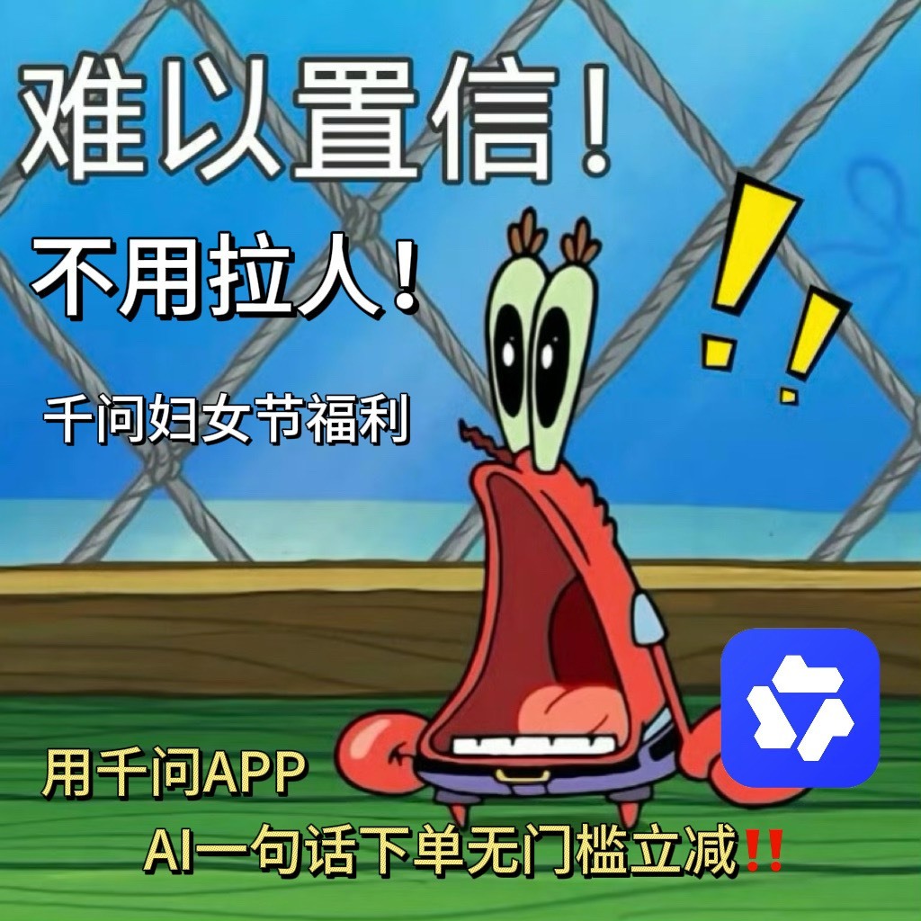 千问AI一句话下单无门槛立减3月6-8号用千问AI一句话下单,即有无门槛立减!!三八节福利主打就是一个直给!刚好要囤面膜湿巾洗衣液,我夸嚓就是精打细算,速速用千问下单,真心觉得方便,AI把我们养得很好,不仅帮我们办事,还能帮我们省钱,简直不要太会过日子!千问宣布妇女节再次请客 千问
