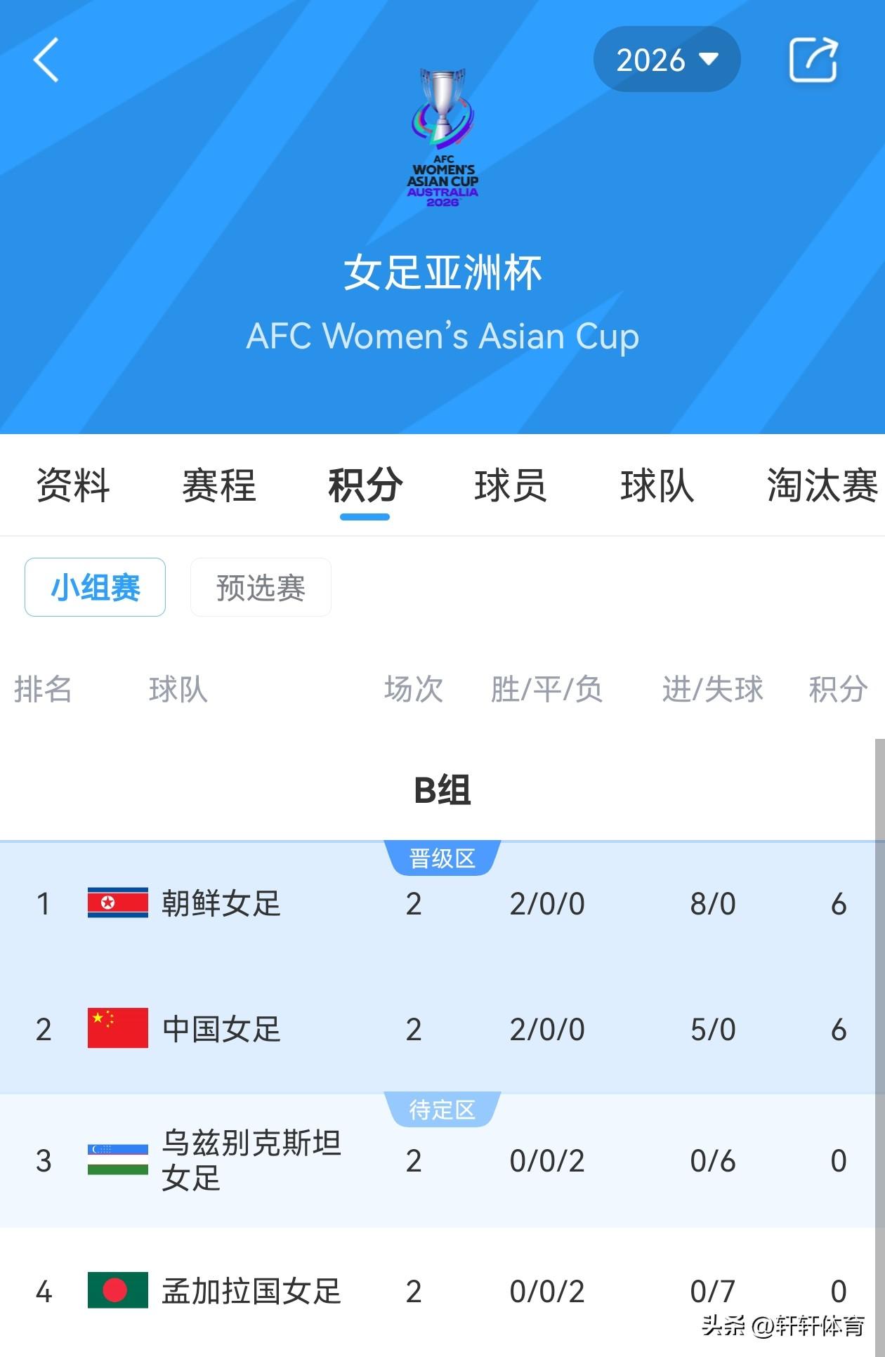 女足亚洲杯B组第二轮今天进行了两场比赛,最终比赛结果中国女足3-0战胜乌兹别克斯坦女足,朝鲜女足5-0战胜孟加拉女足,两轮比赛结束中国与朝鲜女足均两战全胜同积6分,但是由于净胜球原因中国女足暂列小组第二,朝鲜女足排名小组第一,朝鲜女足两轮比赛8粒净胜球,中国女足两轮比赛5粒净胜球,3月8日中国女足将迎战朝鲜女足,取胜的一方将以小组第一出线,输球的一方同样会以小组第二出线,如果打平同样是朝鲜女足小组第一,所以摆在中国女足面前的就只有一条路那就是战胜朝鲜女足,力争小组第一出线,本场比赛中国女足上半场凭借着邵子钦第30分中罚中的由其自己创造的点球,为中国女足首开记录,下半场李晴瞳在第51分钟以及第77分钟的两粒进球,帮助中国女足以3-0锁定胜局,本场比赛中国女足进行了大面积的人员轮换,尤其首发阵容对比一场同样进行了人员调整,调整目的为了给主力队员留足体能,以便3月8日对阵朝鲜女足争夺小组头名,如果中国女足排名小组第二晋级淘汰赛后,可能面对A组的韩国或者澳大利亚女足,对于现在这支中国女足来说,很难保证一定会赢下淘汰赛,如果排名第一将面对C组第二名的越南女足,相对澳大利亚以及韩国女足,战胜越南女足相对来说还是有一定把握的。