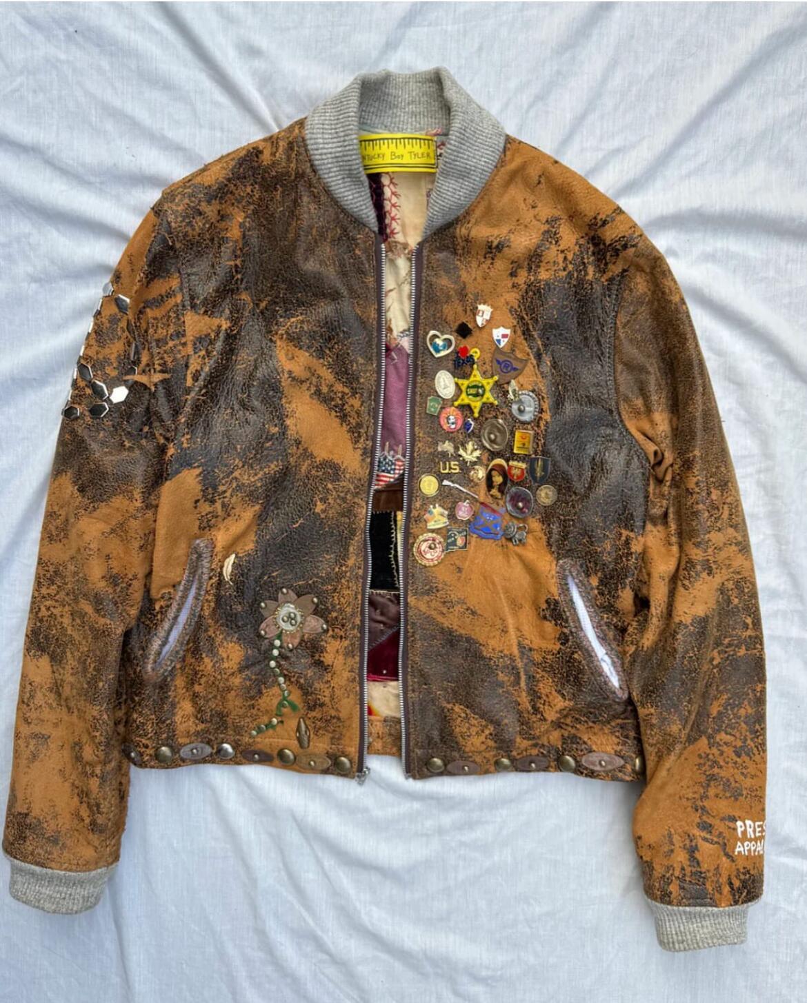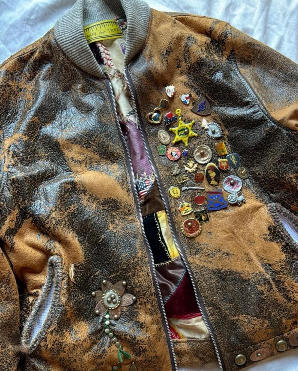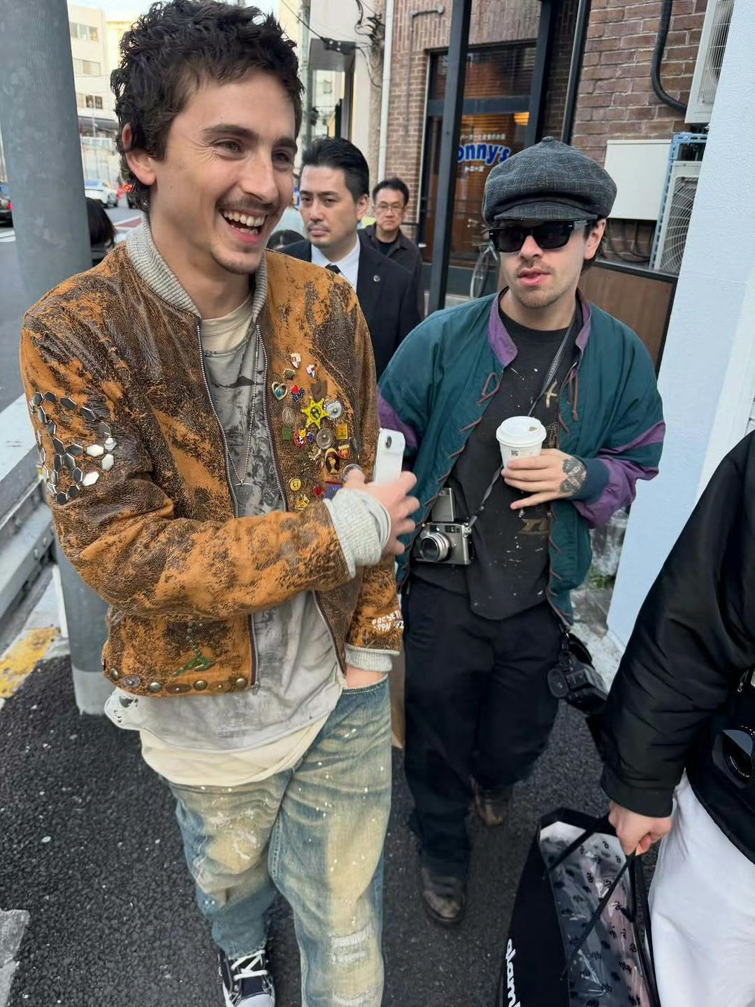 甜茶《至尊马蒂》亚洲行宣传期间,在日本扫街穿的这件Kentucky Boy Tyler做旧羔羊皮棒球夹克,左胸布满复古徽章,同时在其他部位用铆钉做了花朵、反战、USA等元素刺绣,内衬做成拼接布设计,将美式复古与手工质感拉满,非常帅的一件单品!