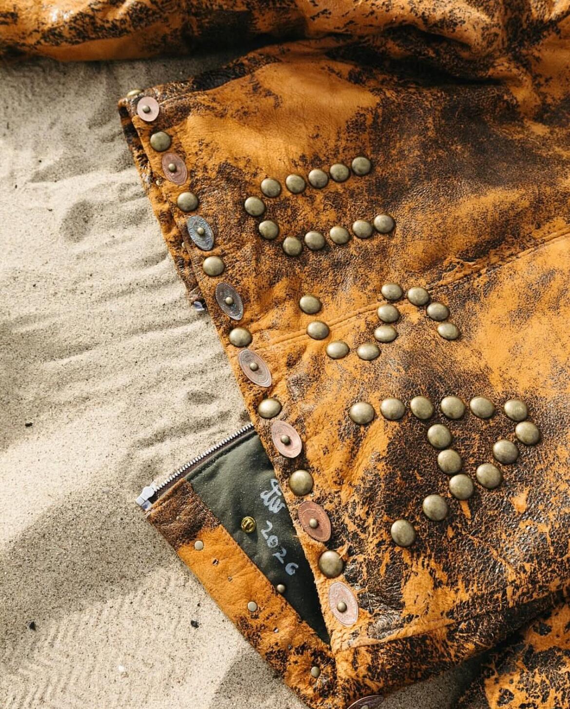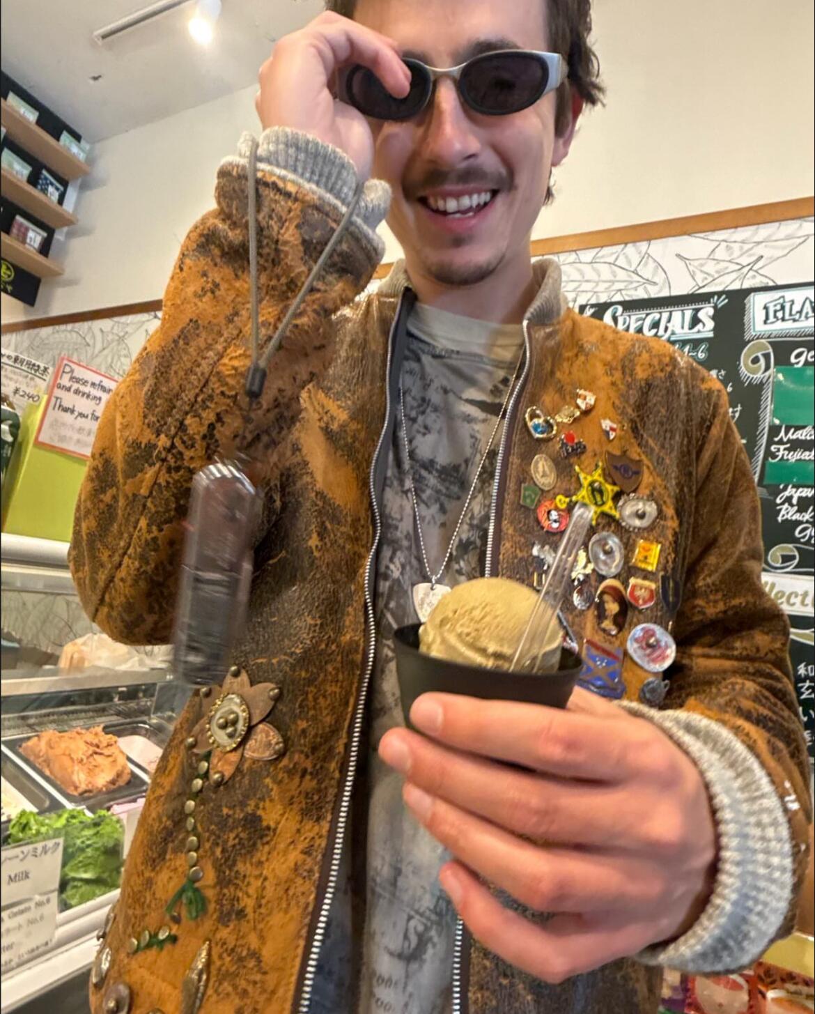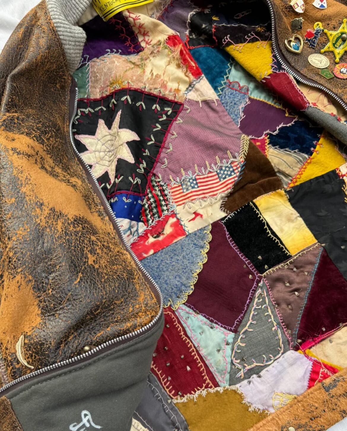 甜茶《至尊马蒂》亚洲行宣传期间,在日本扫街穿的这件Kentucky Boy Tyler做旧羔羊皮棒球夹克,左胸布满复古徽章,同时在其他部位用铆钉做了花朵、反战、USA等元素刺绣,内衬做成拼接布设计,将美式复古与手工质感拉满,非常帅的一件单品!