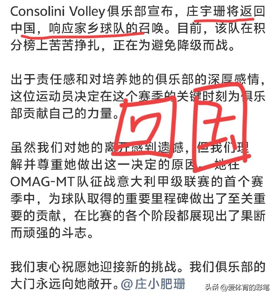 庄宇珊回国了[呲牙],这保完圣乔瓦尼,又保福建女排,她是队伍不可或缺的魂[赞] 庄宇珊在意甲出战14场,累计514扣201中,15发球8拦,共拿到224分,得分和发球均为队内第一,还荣获一次MVP,助力球队成功保级,这能力,这状态不愧是球队的攻防核心。然而没有庄宇珊的福建女排,进攻火力严重不足,联赛成绩一落千丈,差点降级,季后赛也是仅有一胜。看得出,庄宇珊很有责任心,无论她去哪里,我们都支持她,尊重她,继续为她加油✊意甲女排总决赛 庄羽珊意甲首秀 庄玉珊