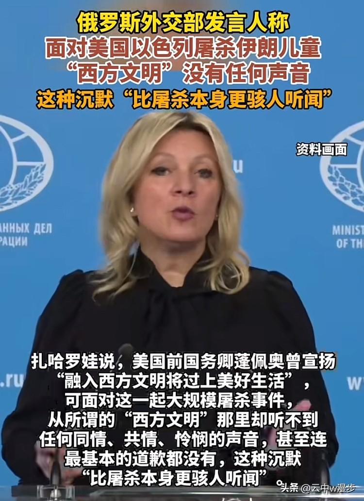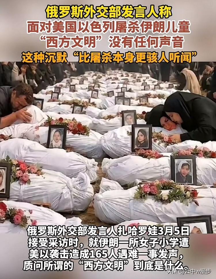 当“西方文明”在伊朗儿童的血泊中沉默 2026年3月5日,俄罗斯外交部发言人扎哈罗娃的一番质问,如同一记重锤,敲在了所谓“西方文明”的虚伪面具上。她直指,当伊朗一所女子小学遭遇美以袭击,165条鲜活的生命,尤其是无辜儿童的生命被无情剥夺时,那些曾宣扬“融入西方文明将过上美好生活”的声音,却陷入了令人窒息的沉默。 这种沉默,远比屠杀本身更骇人听闻。它撕下了“普世价值”的温情面纱,暴露出其背后赤裸裸的双重标准与霸权逻辑。当生命逝去,所谓的“同情”“共情”“怜悯”消失得无影无踪,连最基本的道歉都成了奢望。这不禁让人追问:这样的“文明”,究竟是人类的灯塔,还是制造苦难的根源? 在这个充满血色与谎言的世界里,扎哈罗娃的质问,不仅是对西方的批判,更是对全人类良知的唤醒。我们必须看清,任何以“文明”之名行霸权之实的行径,都终将被历史和正义所唾弃。
