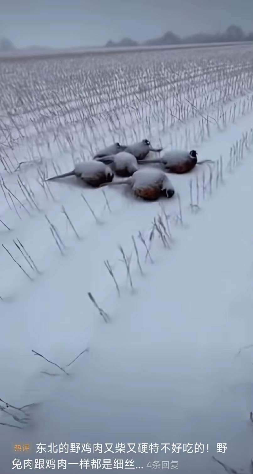 这就是野鸡的生活 家养的鸡就幸福很多,不用愁吃喝,尤其是蛋鸡养殖,冬天加温,夏天开空调,好吃好喝就是每天要产生价值,要不然它们是没有活路。 野鸡虽说环境差,下雪天有可能找不到吃的,但是它可是国家级的保护动物,只要自己饿不死,没有人敢打它的主意。