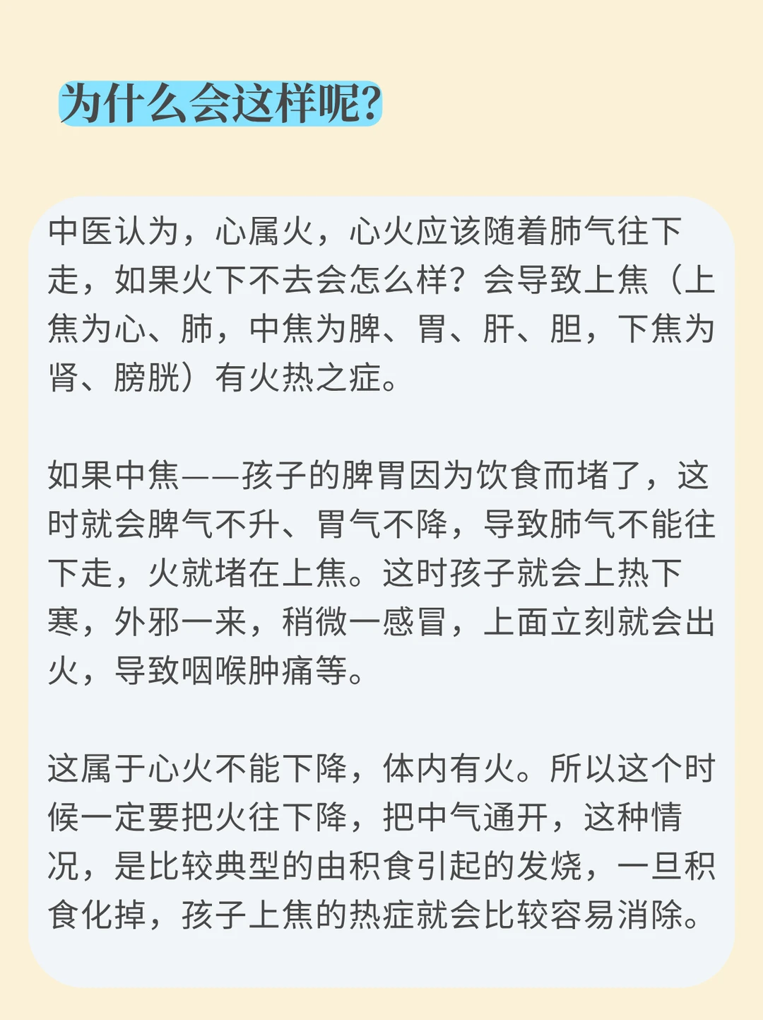 如果中焦——孩子的脾胃因为饮食而堵了,这时就会脾气不升、胃气不降,导致肺气不能往下走,火就堵在上焦。这时孩子就会上热下寒,外邪一来,稍微一感冒,上面立刻就会出火,导致咽喉肿痛等。