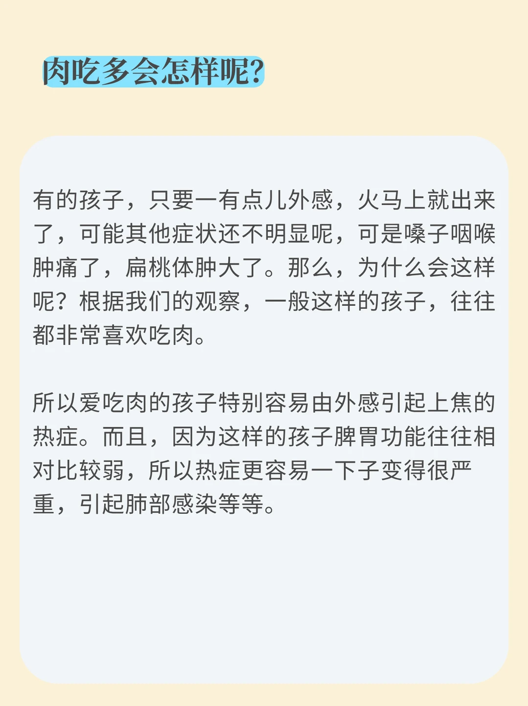 爱吃肉的孩子特别容易由外感引起上焦的热症。而且,因为这样的孩子脾胃功能往往相对比较弱,所以热症更容易一下子变得很严重,引起肺部感染等等[失望R]。