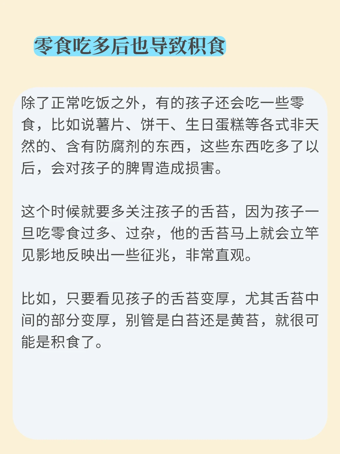 [红色心形R]这个时候就要多关注孩子的舌苔,因为孩子一旦吃零食过多、过杂,他的舌苔马上就会立竿见影地反映出一些征兆,非常直观。比如,只要看见孩子的舌苔变厚,尤其舌苔中间的部分变厚,别管是白苔还是黄苔,就很可能是积食了。