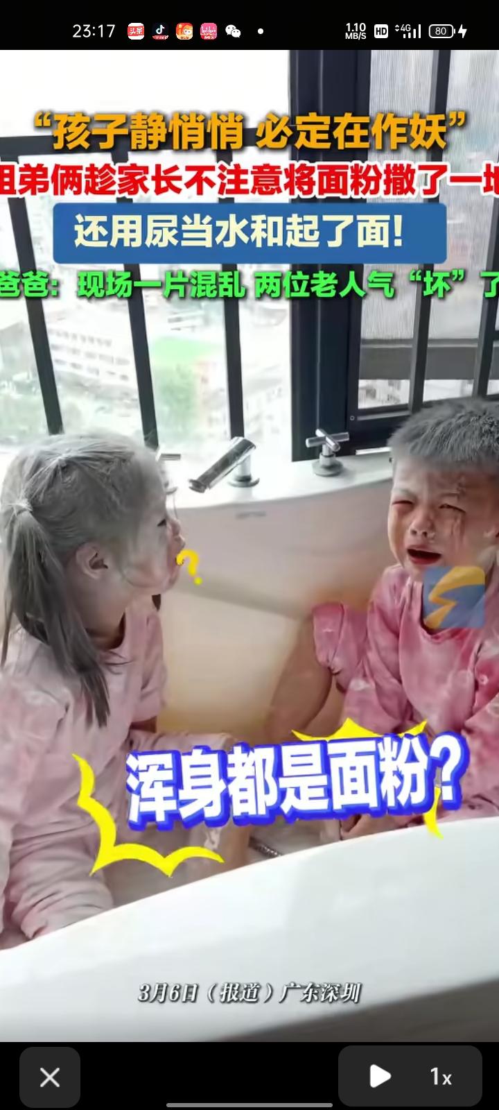 3月6日,广东深圳。孩子爸爸姚先生称,两孩子玩面粉把卧室变成“雪场”,当时孩子奶奶在做饭,姥姥在收拾另一个房间,两孩子平时一直自己玩,没过多关注,等老人发现后已经气坏了,这分明是浪费粮食。