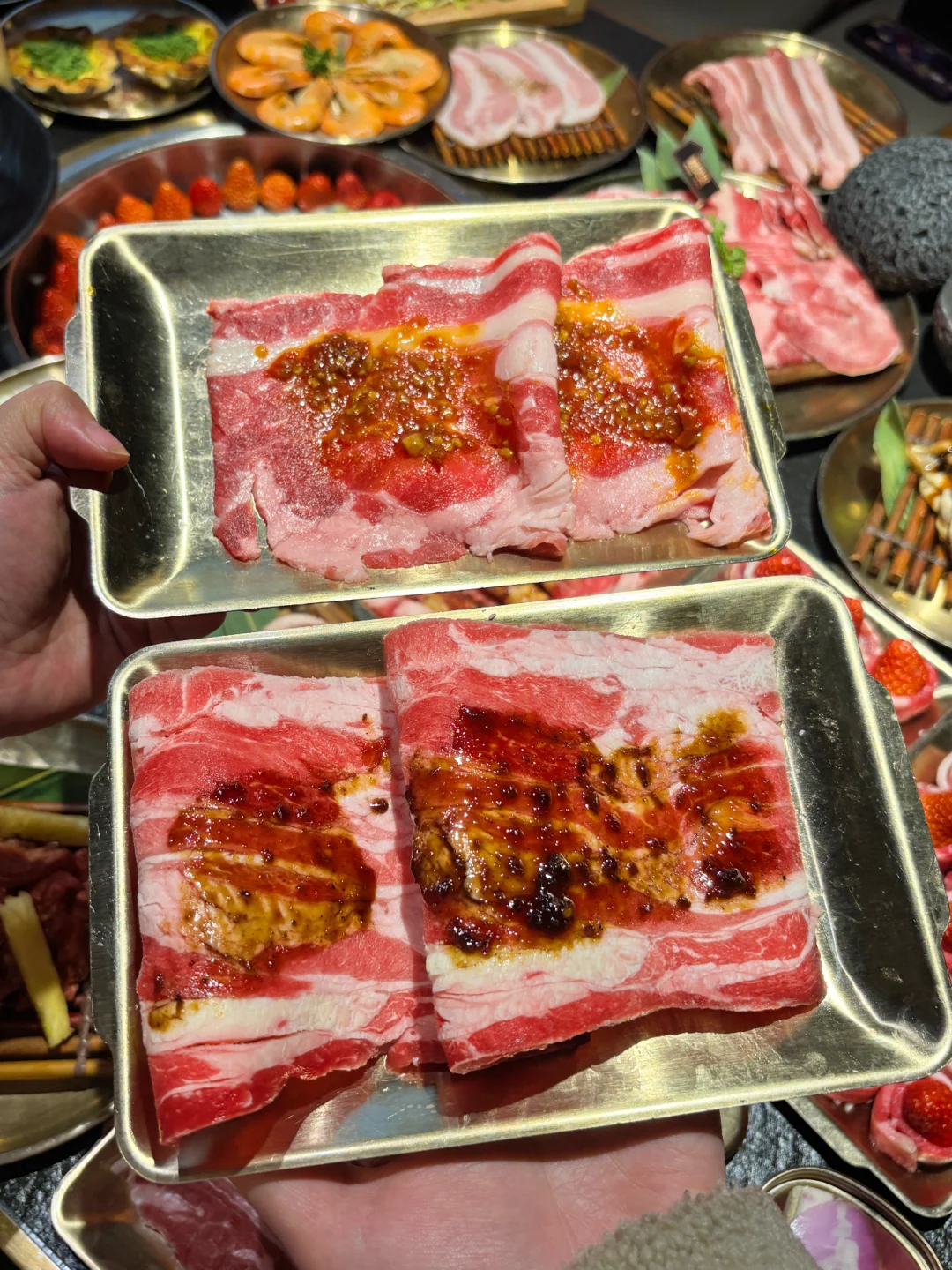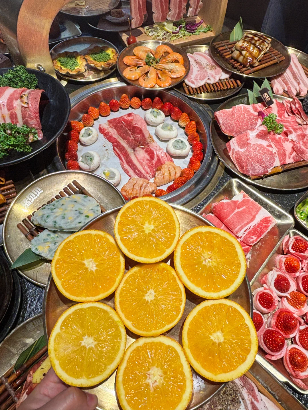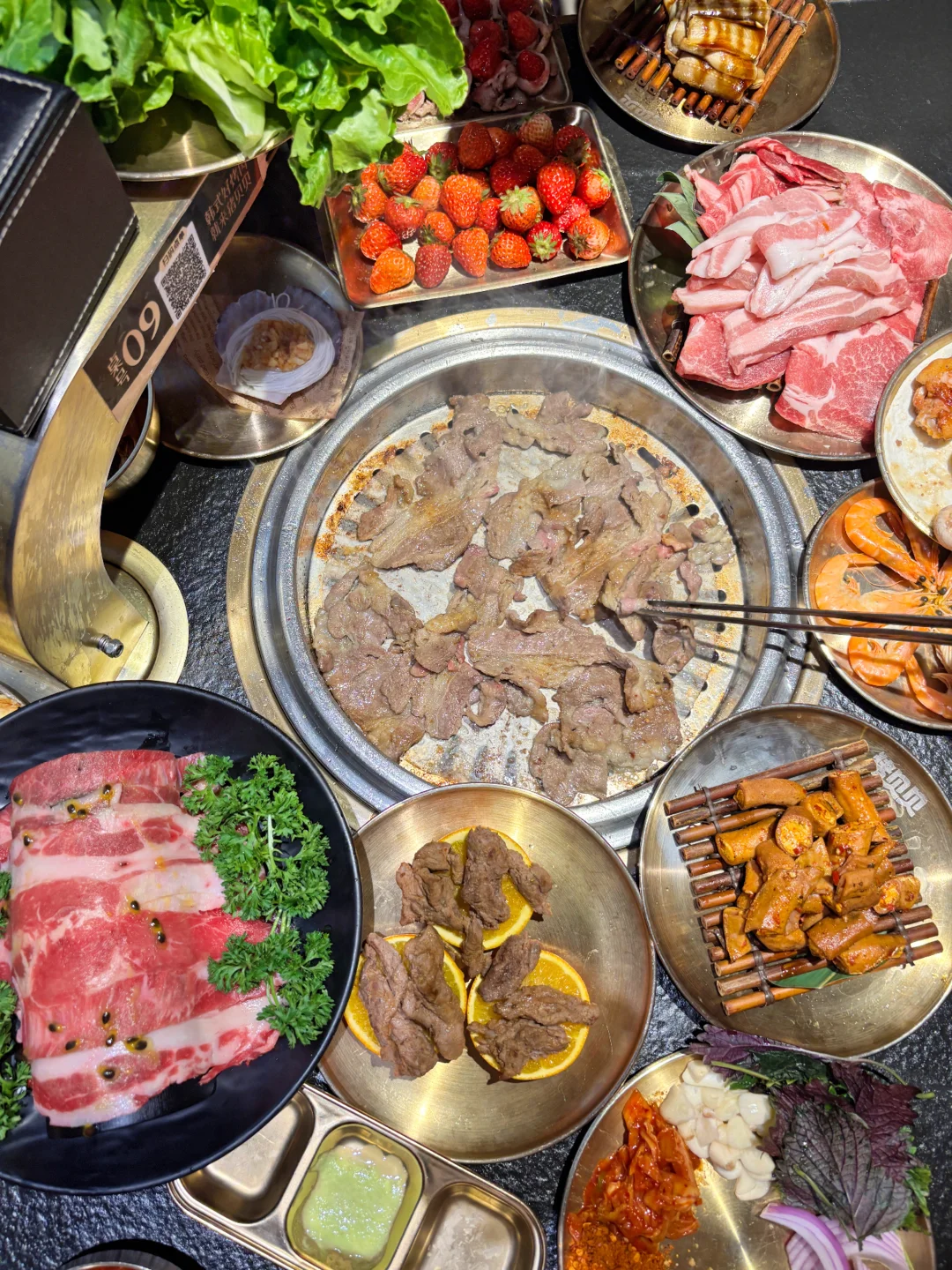 谁说吃高品质牛肉🐂很贵?猪贝贝这次趁着草莓🍓季直接搞了个安格斯牛肉节!人均几十块就能吃到高品质的安格斯牛肉,学生党也能轻松约起来!🙌 除了经典的原切安格斯肥牛,🥩还有秘制黑椒和百香果口味的!🍍百香果肥牛真的太上头了,果香超级清新,烤完肉香四溢,完全不腻!😋 真的被他们家的牛肉创意法吃法惊艳到了!自己DIY!卷上新鲜的菠萝🍍、草莓🍓一起烤,水果的汁水瞬间渗透进肉里,鲜嫩多汁,口感层次丰富到飞起!🤤 店里环境是黑金风,高级感满满但价格很接地气!🖤💛扫码点单懒人福音,不用等!这快乐谁吃谁知道!😋