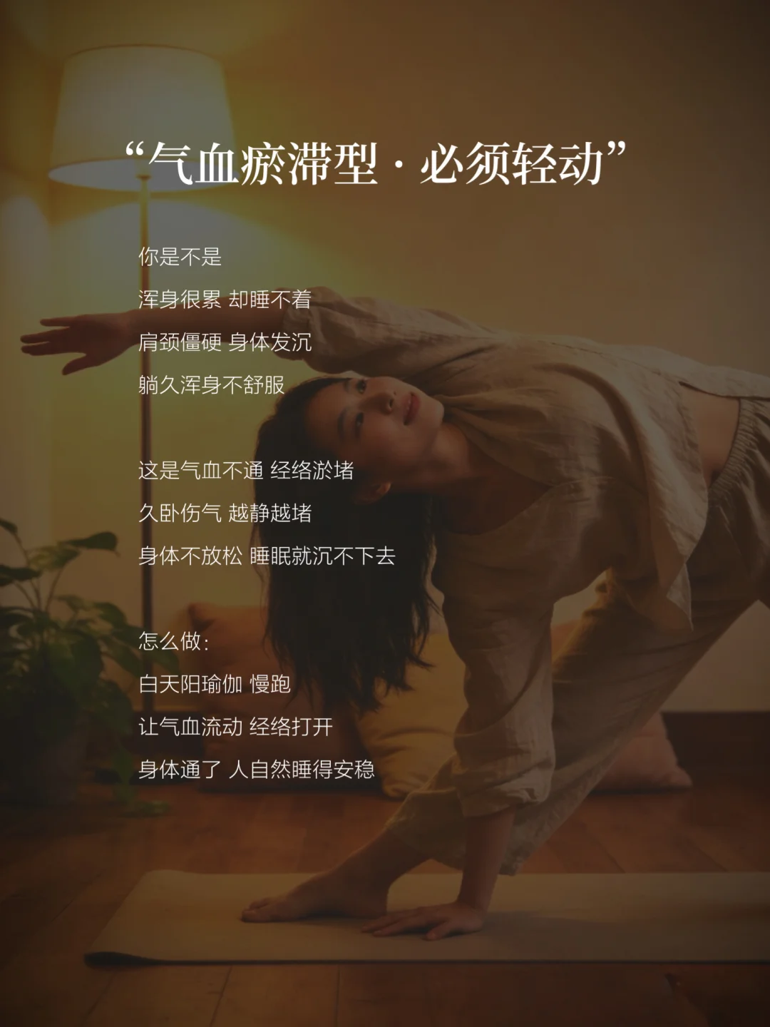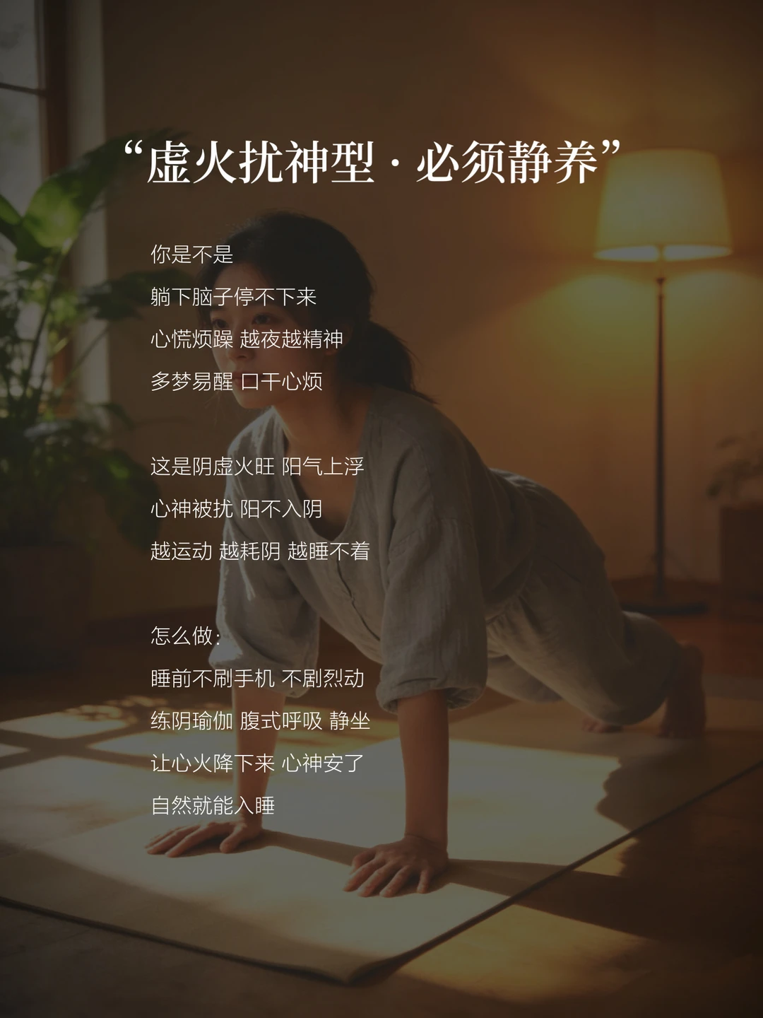 作为瑜伽老师+妈妈 越来越明白失眠 从来不是不够累 而是阴阳失衡 气血不归位 有人越动越清醒 有人越静越失眠 方向对了,睡眠才会真的好 ❶ 虚火扰神型 · 必须静养 你是不是躺下脑子停不下来 心慌烦躁 越夜越精神 多梦易醒 口干心烦 这是阴虚火旺 阳气上浮心神被扰 阳不入阴越运动 越耗阴 越睡不着 ✅ 怎么做睡前不刷手机 不剧烈动练阴瑜伽 腹式呼吸 静坐让心火降下来 心神安了自然就能入睡 ❷ 气血瘀滞型 · 必须轻动 你是不是浑身很累 却睡不着肩颈僵硬 身体发沉 躺久浑身不舒服 这是气血不通 经络淤堵久卧伤气 越静越堵身体不放松 睡眠就沉不下去 ✅ 怎么做白天阳瑜伽 慢跑 拉伸让气血流动 经络打开身体通了 人自然睡得安稳 ❸ 失眠的本质:阴阳不合 古人说静生阴 动生阳阴平阳秘 精神乃治静养 是为了安神降火运动 是为了行气通脉一静一动 顺应身体睡眠才是真正的修复 ❹ 女人好睡眠 靠三者同养 饮食温养 补气血之本睡眠守时 固阴阳之根阴阳瑜伽 调身心平衡吃对+睡对+练对 才是长期安稳的底气 也是我做气血营的初心用温柔的方式 养回气血与好睡眠愿我们不内耗 不硬撑 不焦虑 在一静一动间找回安睡 找回气血活成 温柔又有力量的自己