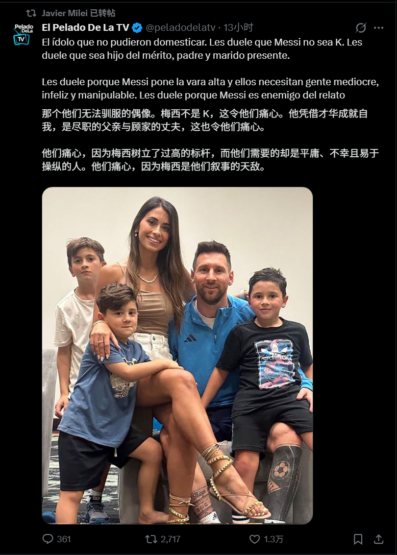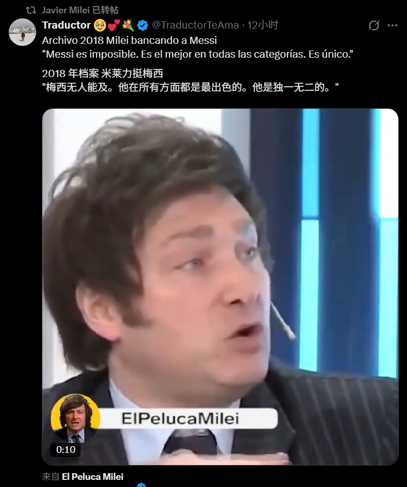 阿根廷总统哈维尔·米莱连转三条推文回应那些批评梅西的人!