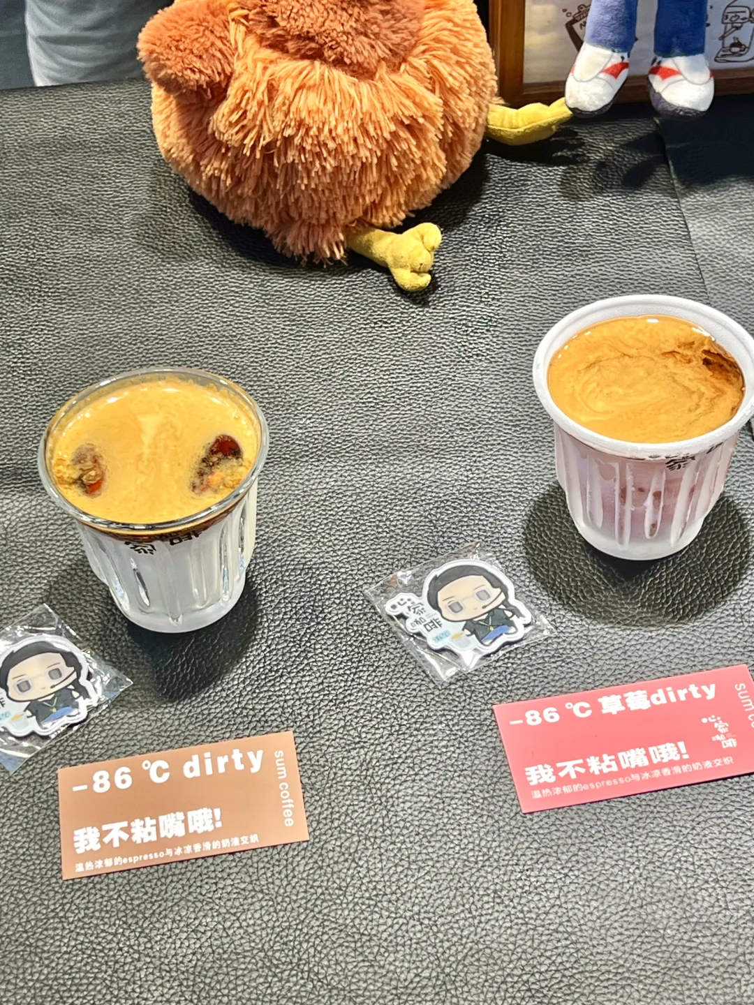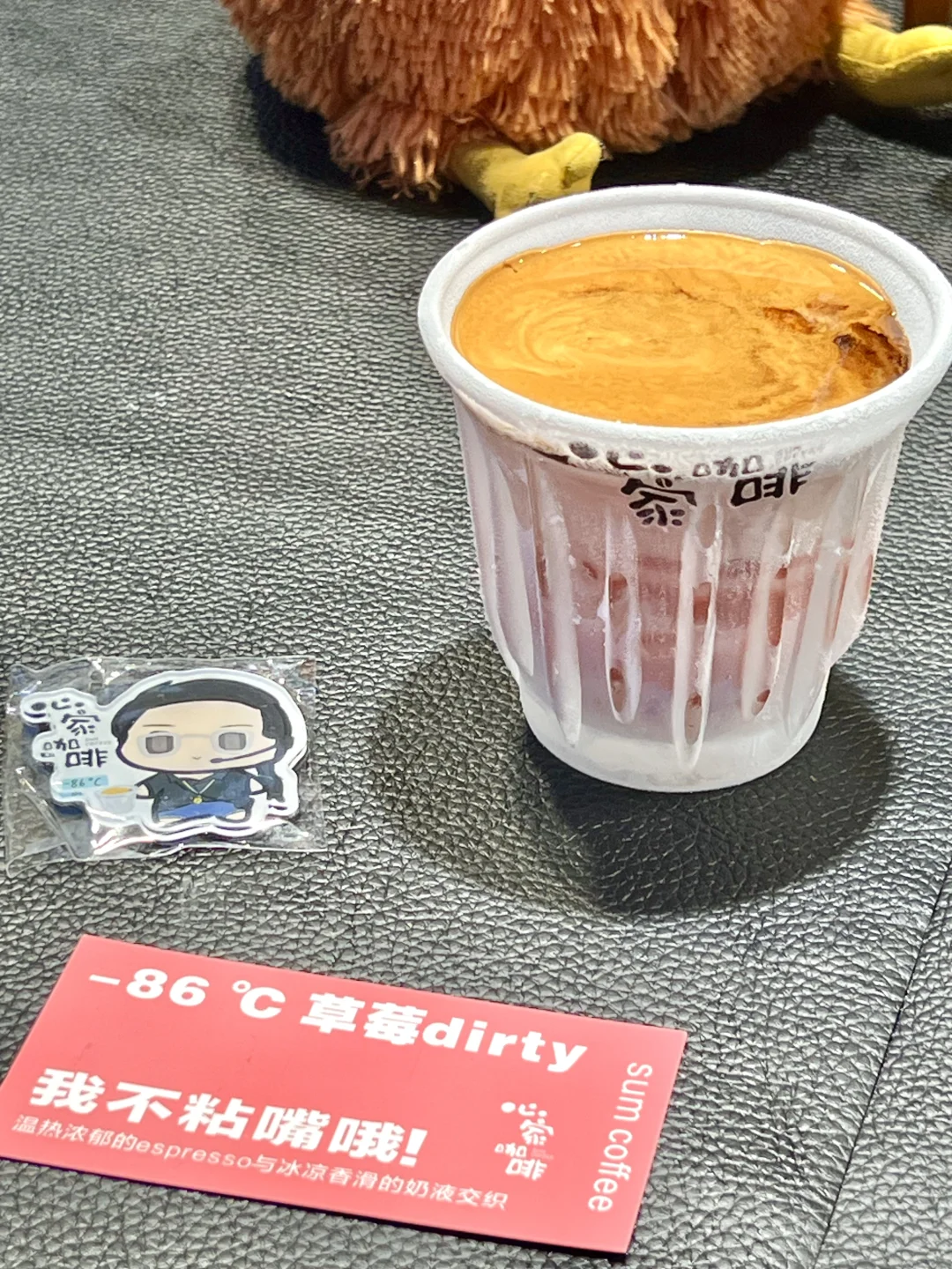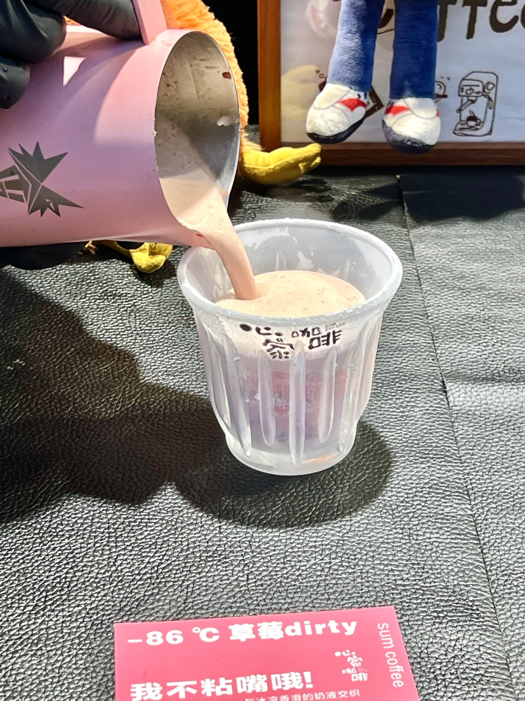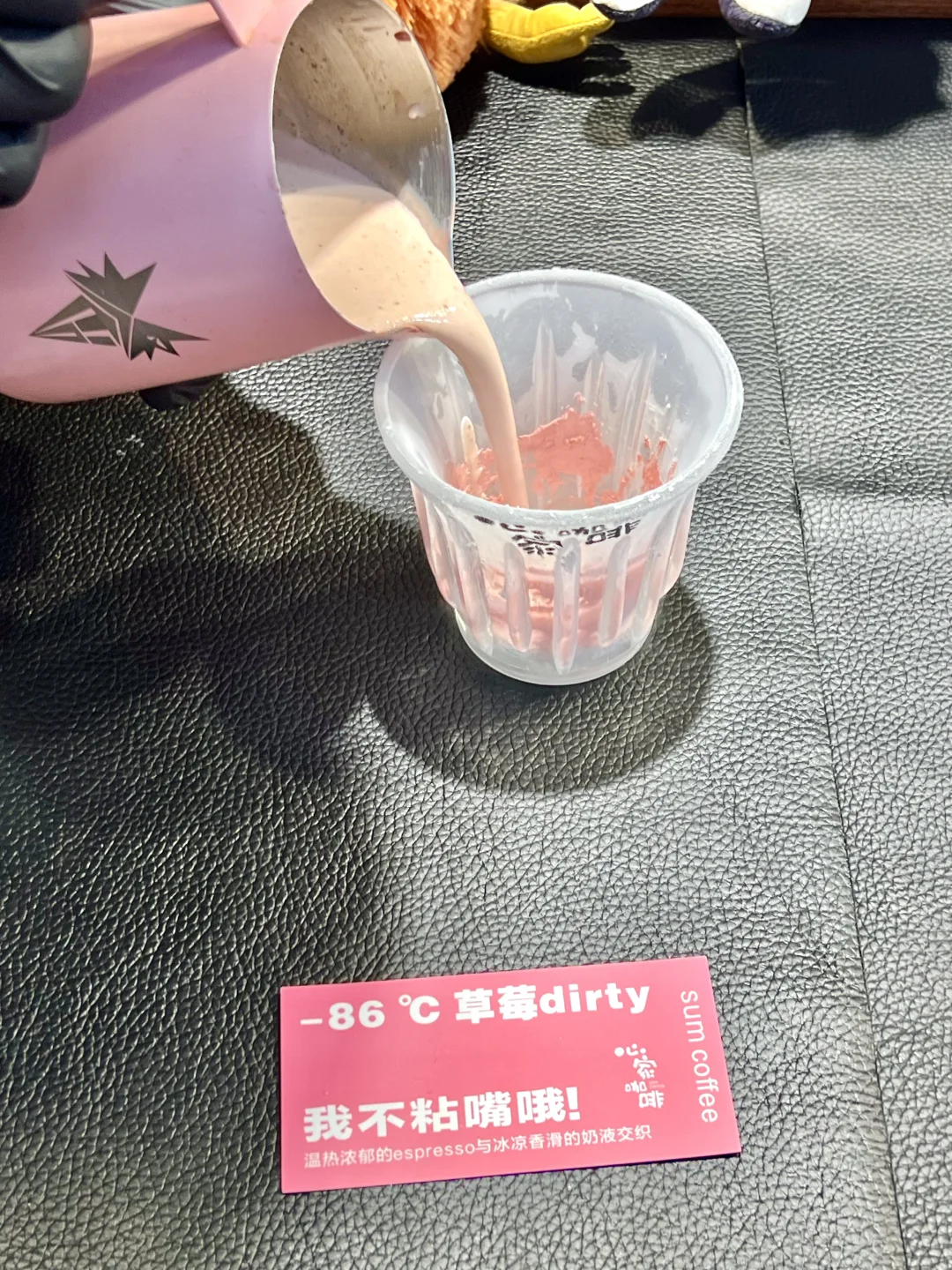 等了一年!!!终于又喝上了心家的冰杯dirty 那个冒着仙气儿的冰杯很吸睛了 -86℃冰杯Dirty 咖啡师拿出来的时候全是白雾 仪式感直接拉满 新出的草莓味真的太懂女生了! 杯壁上一层白白的霜,喝起来口感像在吃咖啡味冰淇淋,绵绵密密的。 咖啡香和草莓果香混在一起,一点都不甜腻,一口下去直接沦陷。 喝完还有惊喜彩蛋!那个-86°冰杯能直接带走,耐热又耐冷,带回家还能接着用,还有冰箱贴送,收集控狂喜! 江门咖啡节
