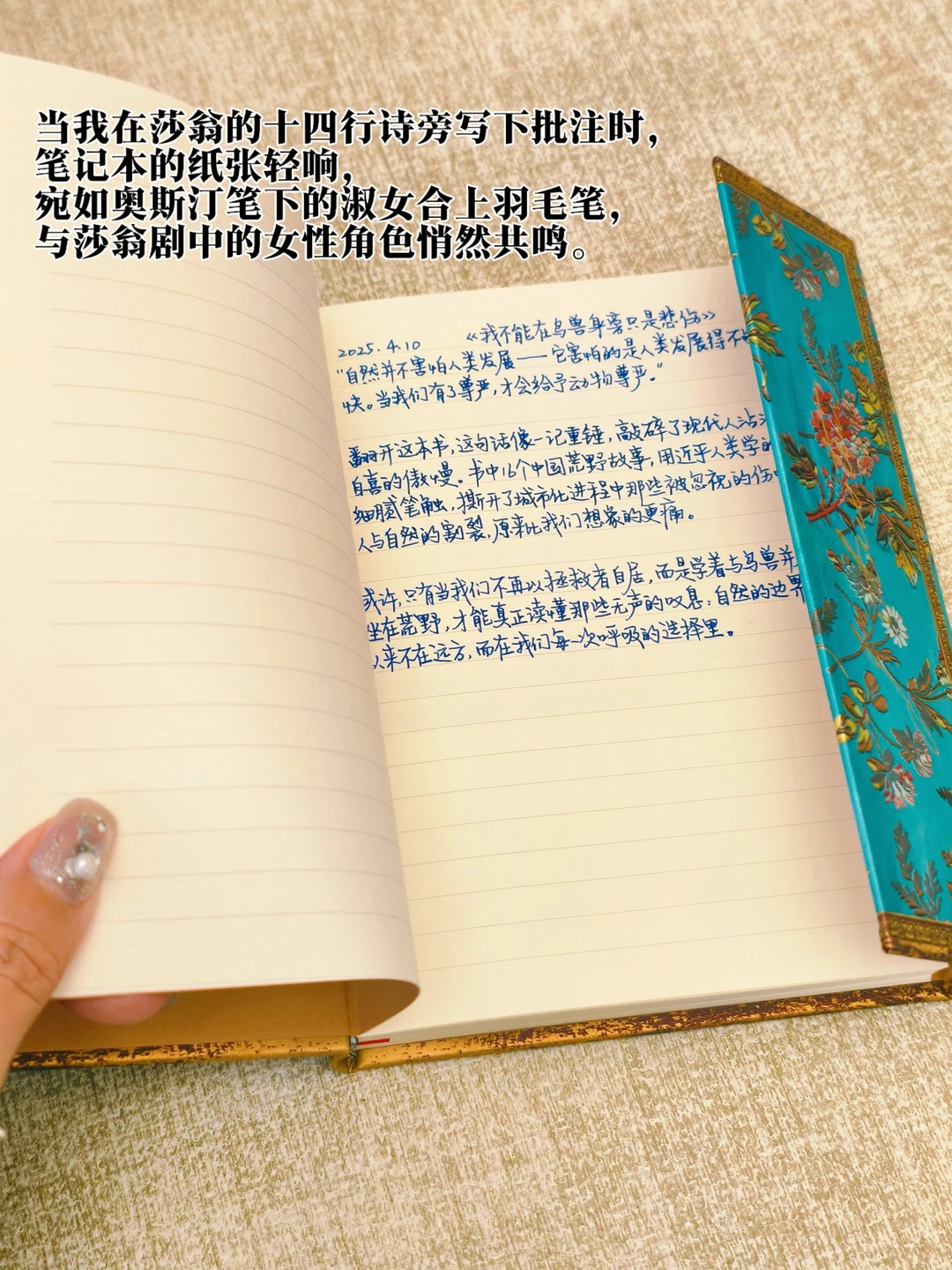 最近特别钟爱这本充满复古气息的笔记本,灵感源自简·奥斯汀《劝导》的手稿。深绿仿皮质封面压印着奥斯汀书信中的花纹,烫金藤蔓缠绕着书脊,内页的淡黄纸张仿佛浸透了旧时光的墨香。