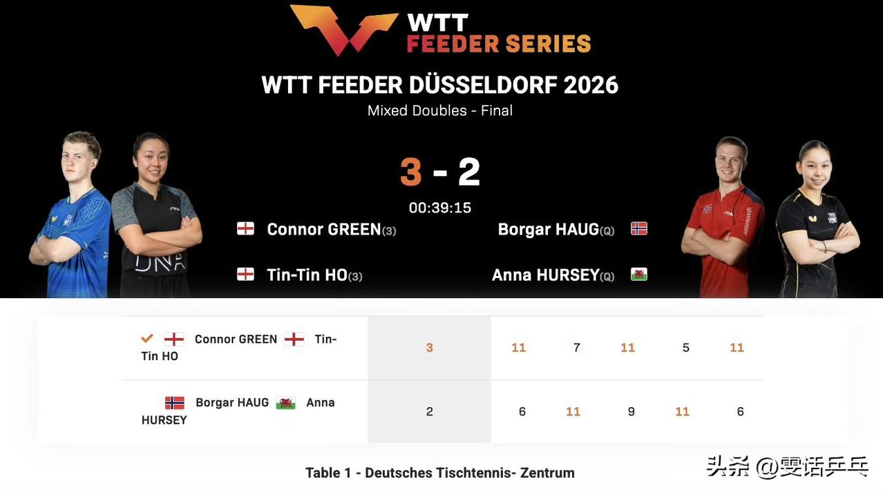 格林/何天天,夺得混双冠军! WTT支线赛杜塞尔多夫站2026 混双决赛:3.6 格林/何天天🏴3-2博格🇳🇴/赫尔西🏴【11-6,7-11,11-9,5-11,11-6】 格林/何天天🏴获得WTT支线赛杜塞尔多夫站混双冠军🥇🎉 博格🇳🇴/赫西🏴获得WTT支线赛杜塞尔多夫站混双亚军🥈