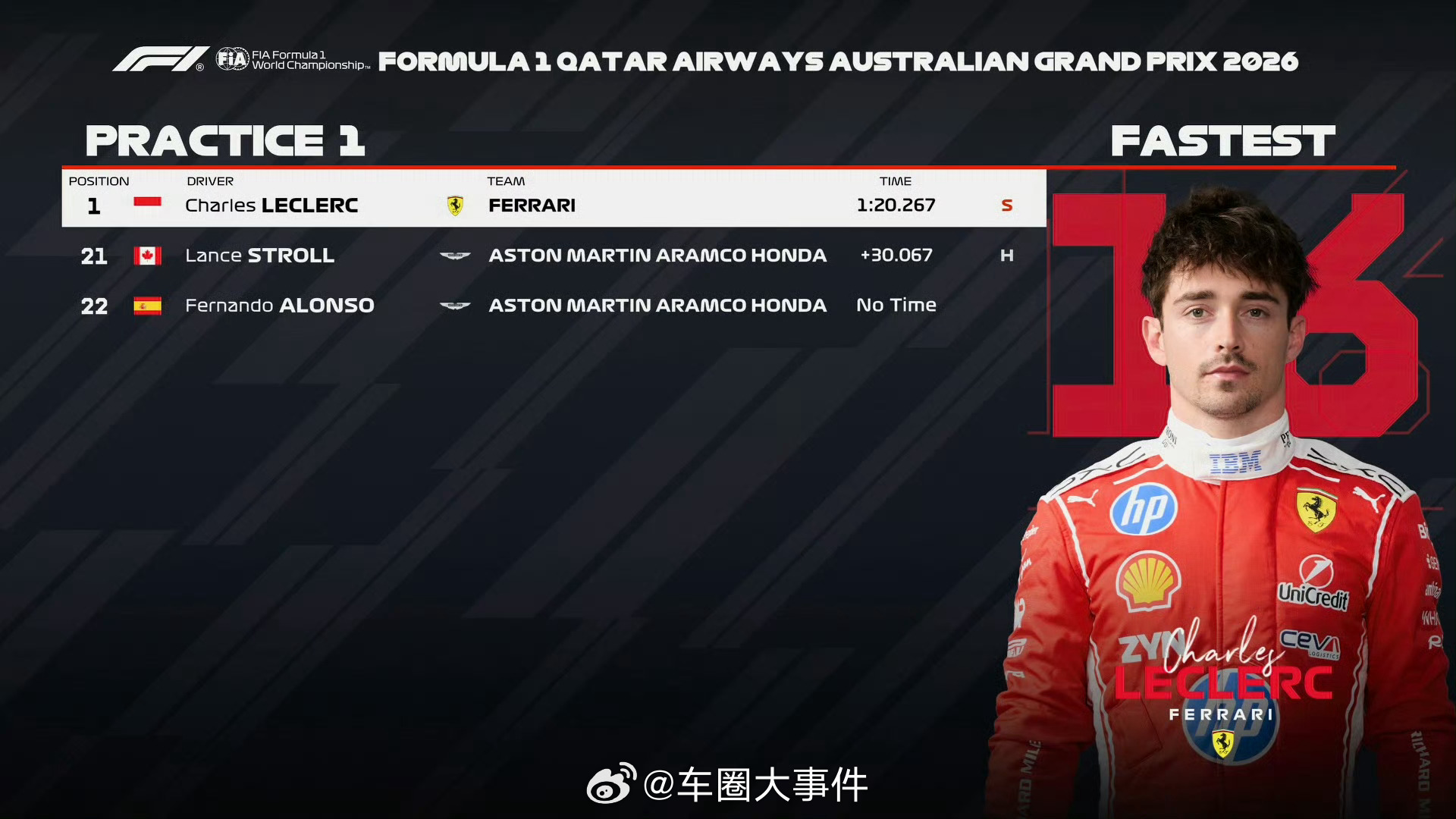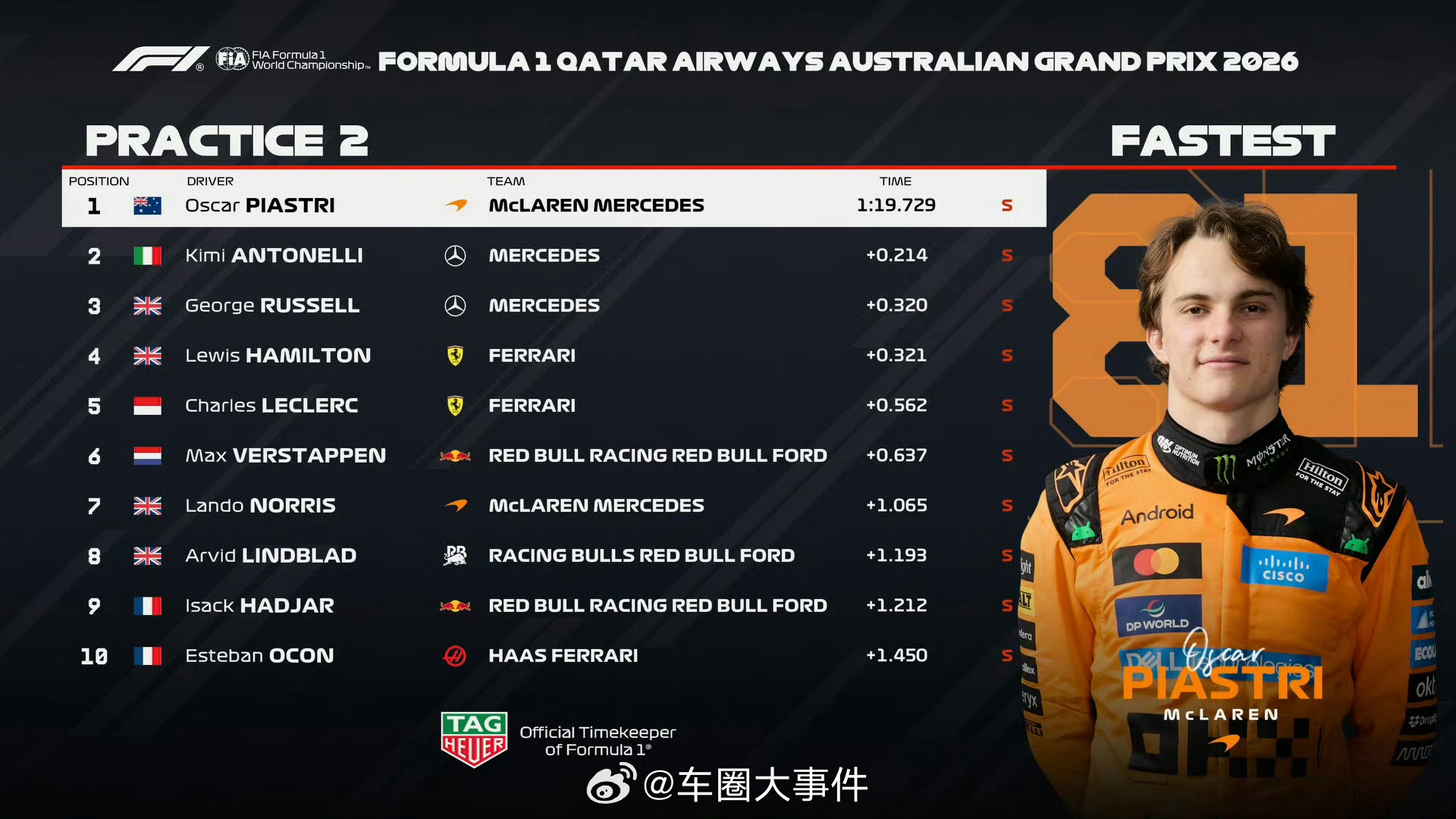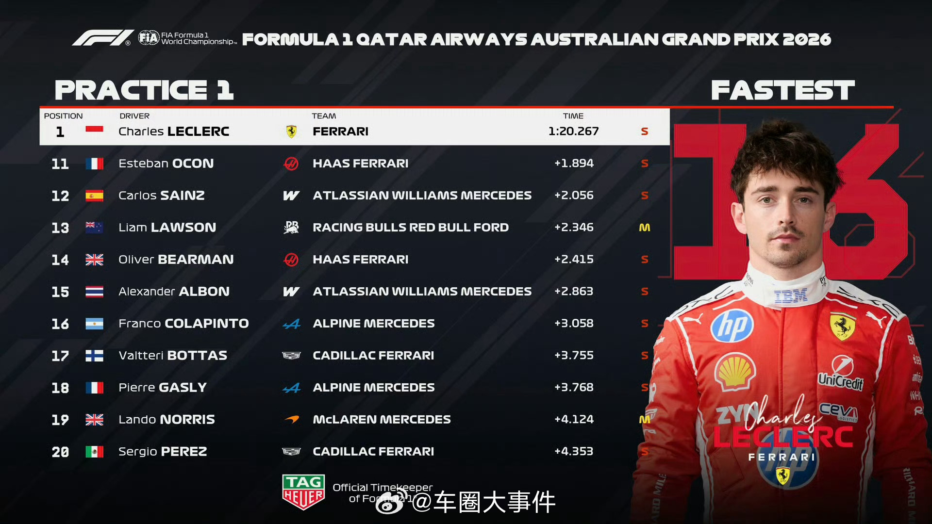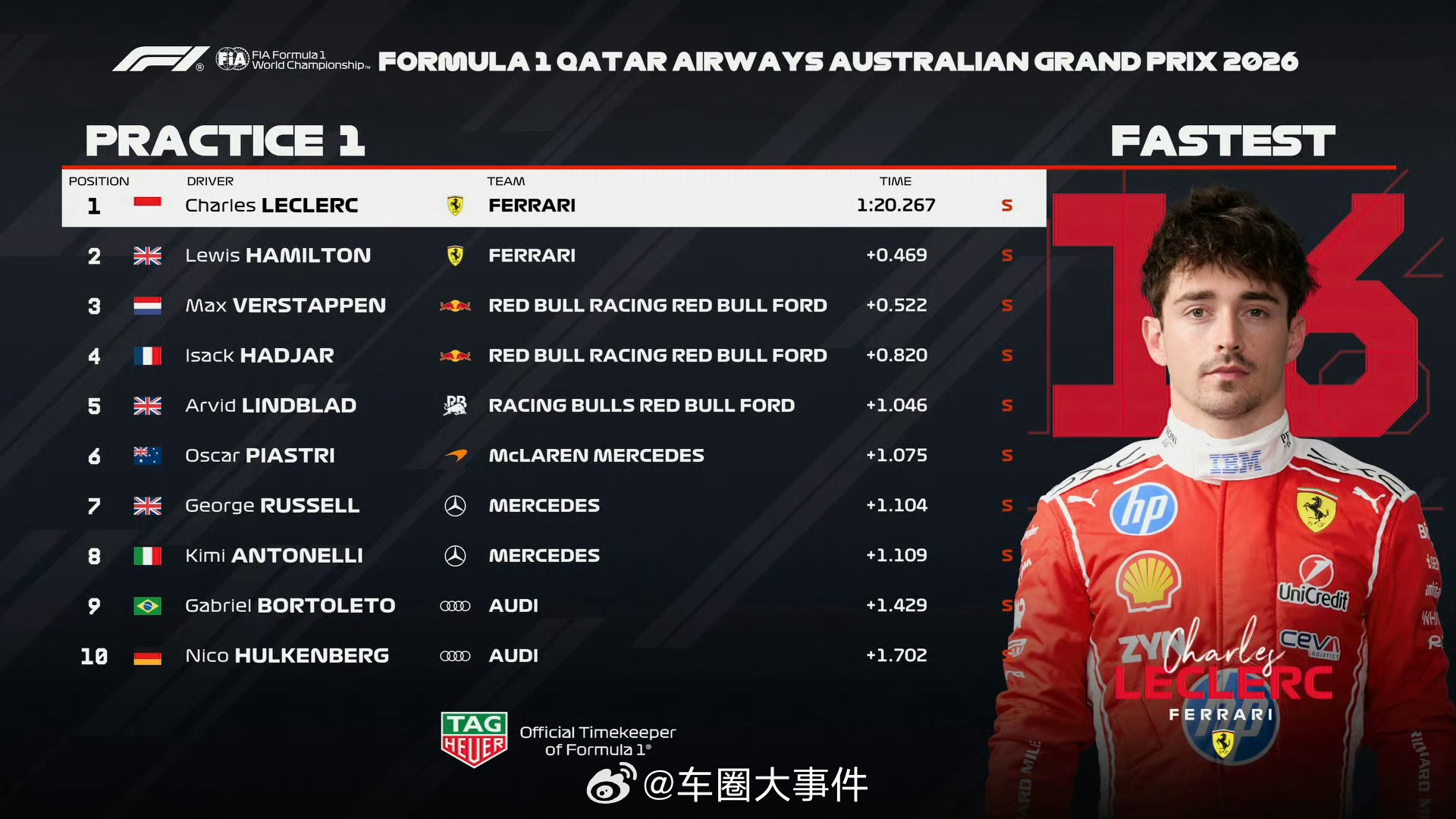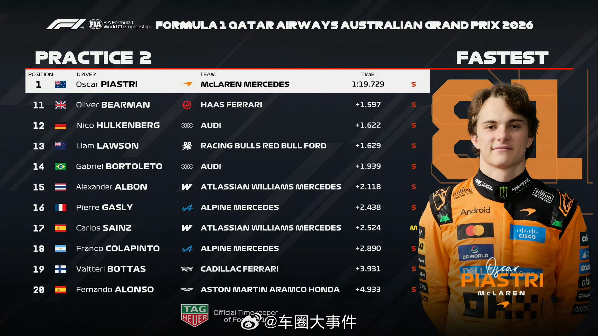 一练、二练成绩已出炉,一起来看看表现如何? 奥迪重返F1 2026f1澳大利亚大奖赛