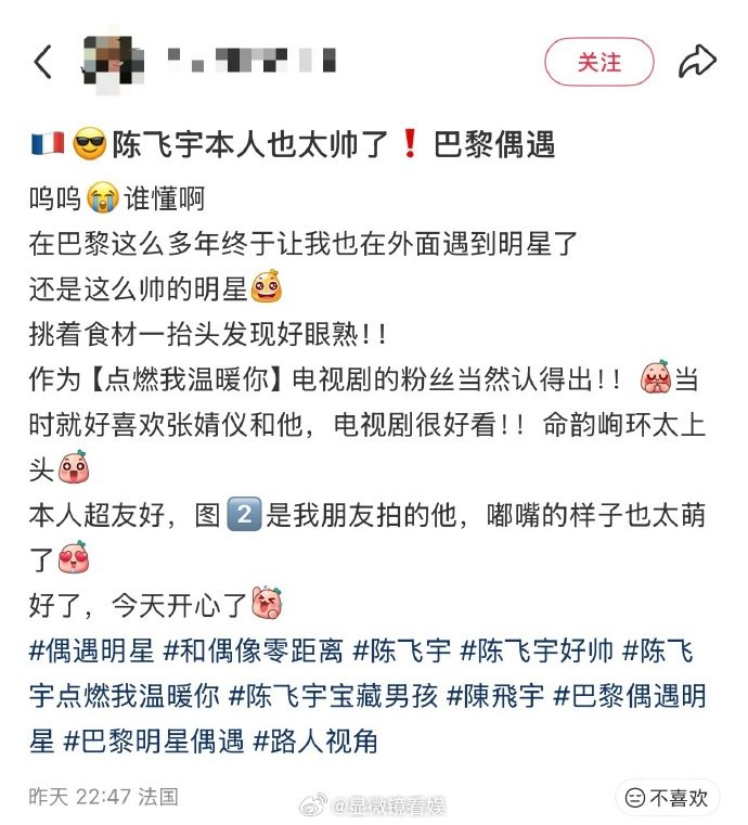 陈飞宇和粉丝合照 有人在巴黎偶遇陈飞宇,晒出合照大赞他超友好!镜头前酷酷的,合照