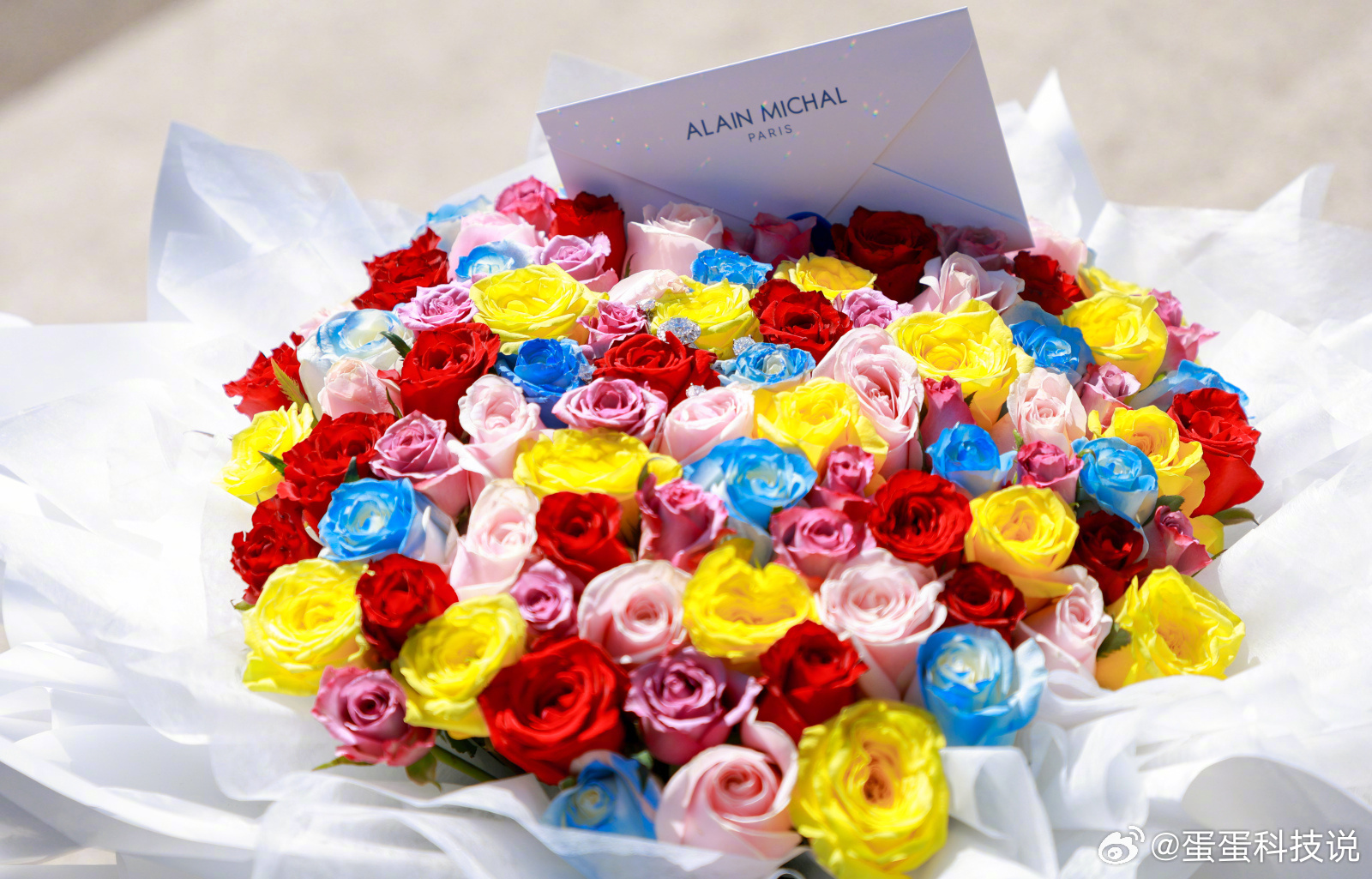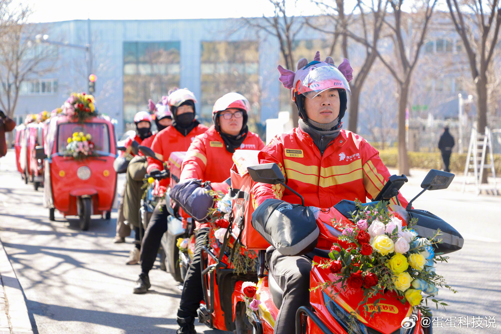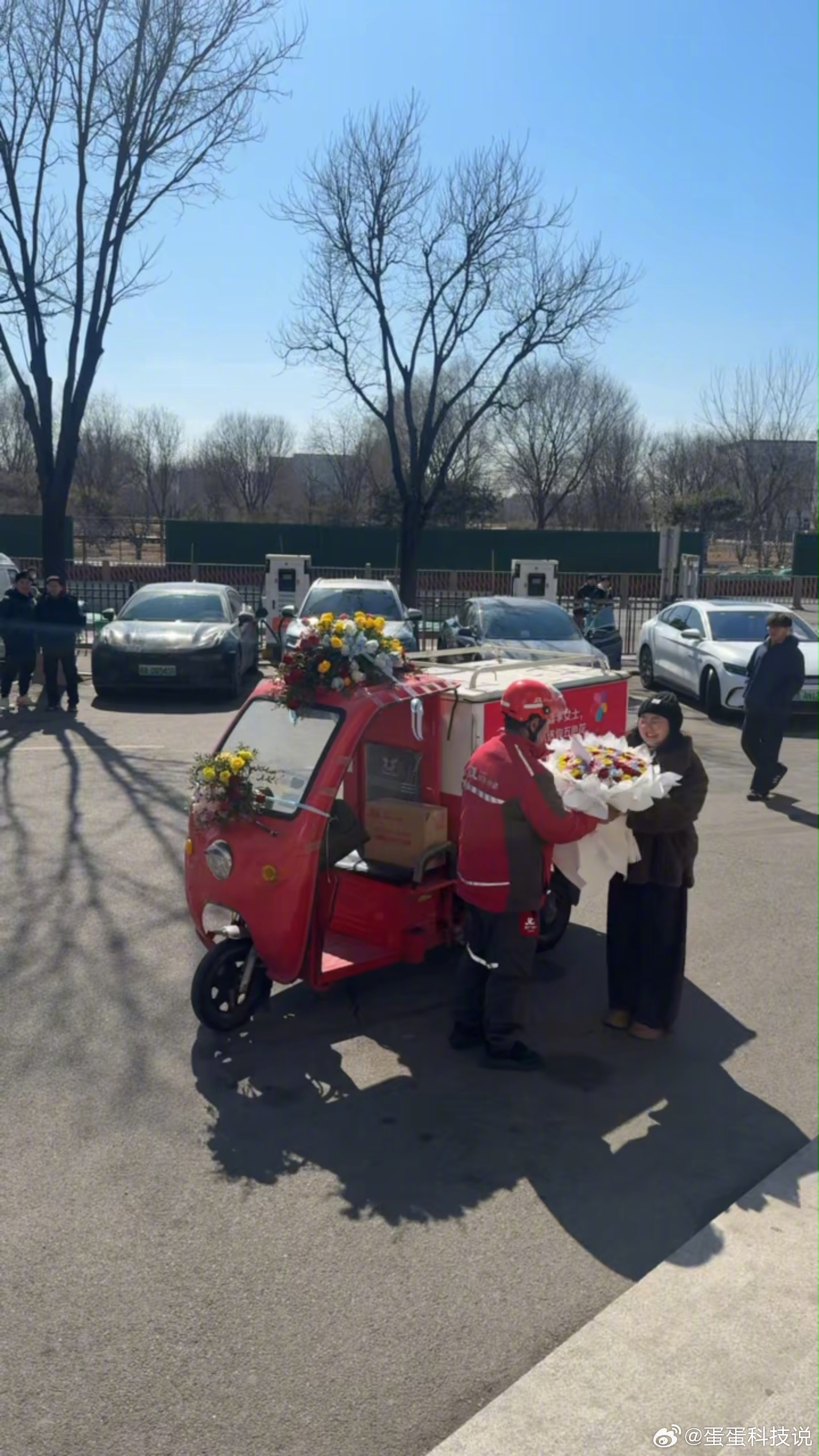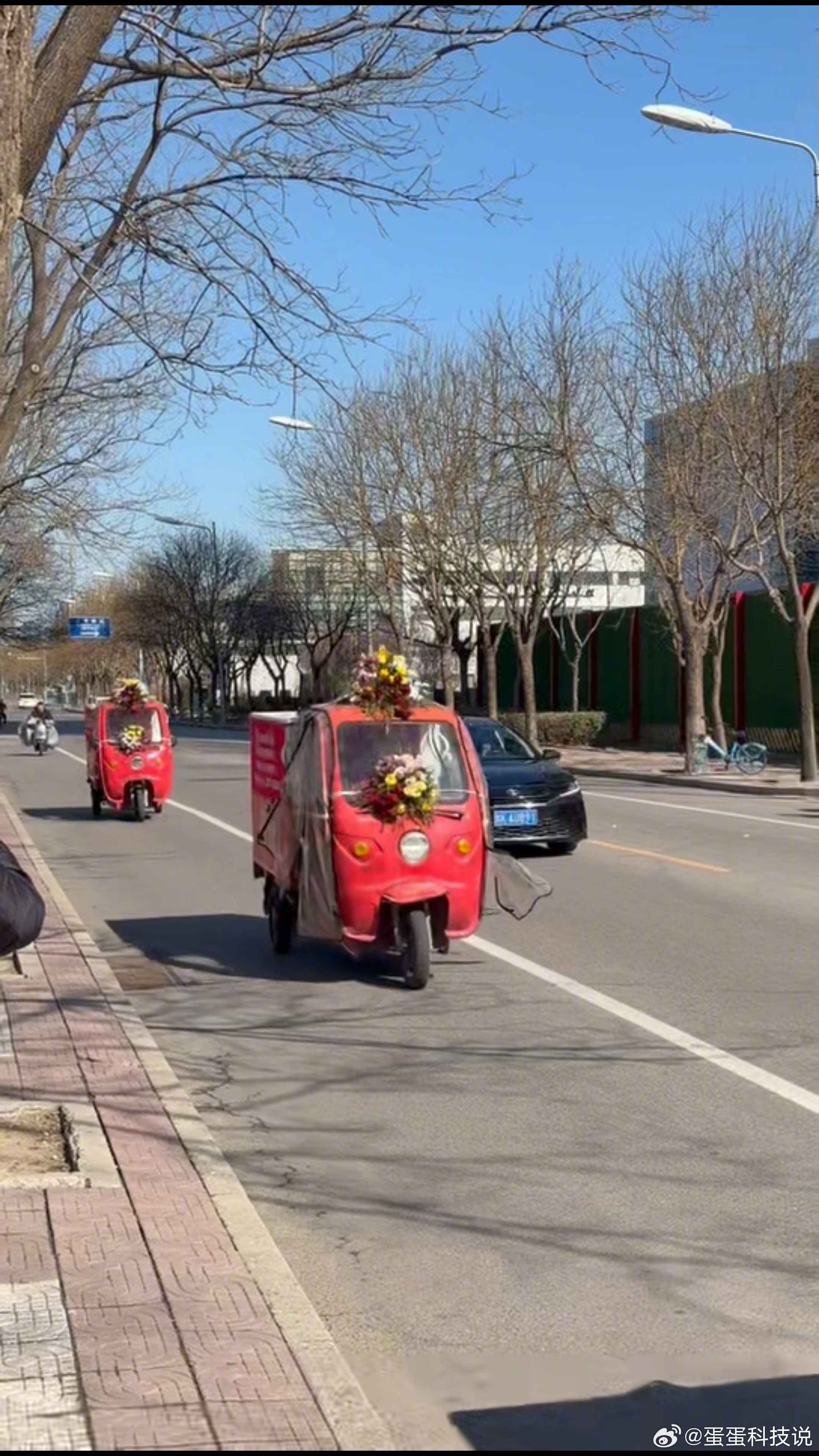 花车队伍还不小,有顶着鲜花的三轮快递车和咱们外卖电动车,除了车上有鲜花点缀之外,我还注意像外卖小哥的头盔还是可爱毛绒款!真的把仪式感拉满了。而且感觉收到花的女孩子一定会很幸福!五色带钻石的花,还贼大一束,太美了!