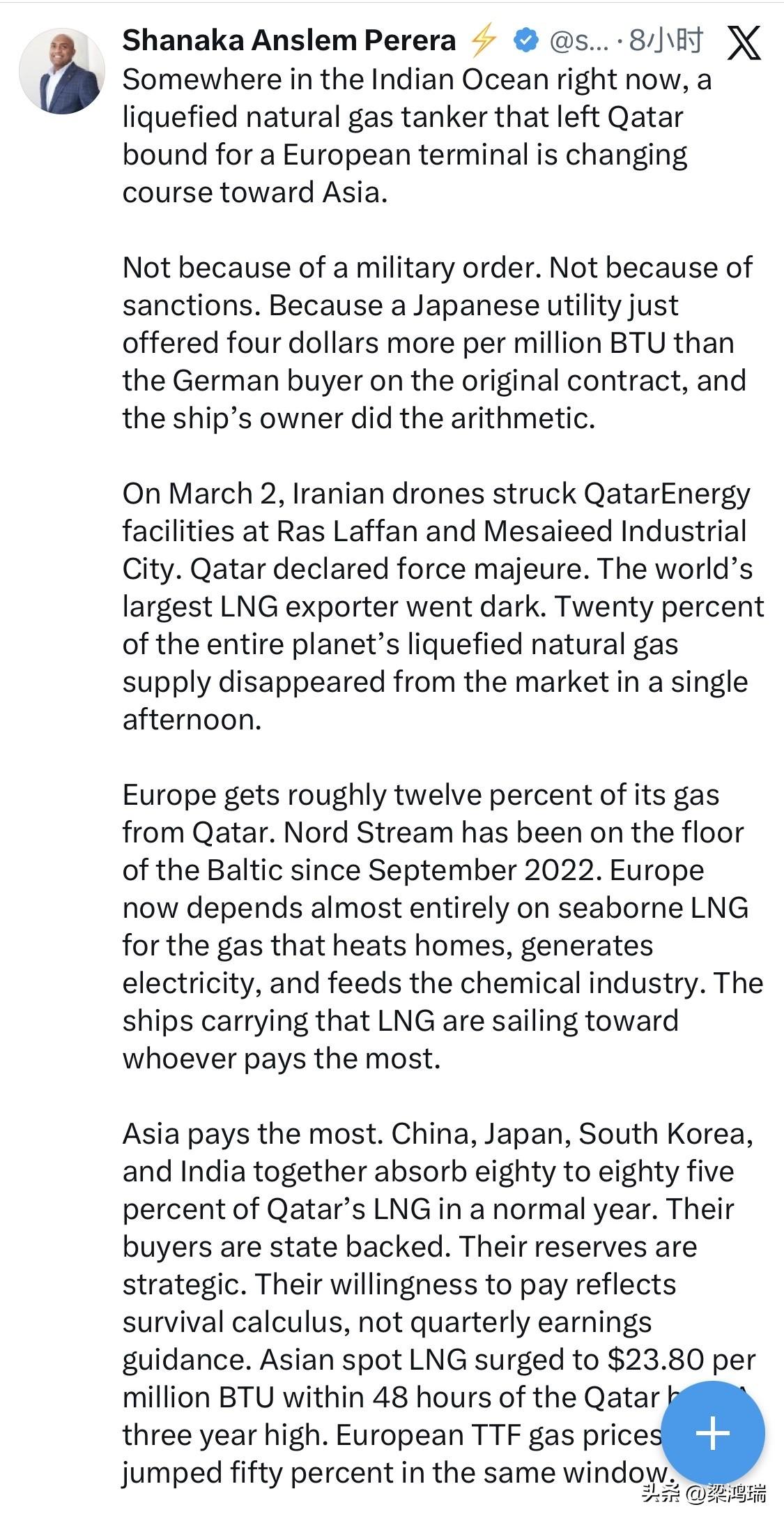 此刻,在印度洋的某个地方,一艘从卡塔尔出发前往欧洲码头的液化天然气运输船正在改变航向,驶向亚洲。 并非因为军方命令,也并非因为制裁,而是因为一家日本公用事业公司在原合同中给出的价格比德国买家每百万英热单位高出4美元,而船东算了一下这笔账。 3月2日,伊朗无人机袭击了卡塔尔能源公司位于拉斯拉凡和梅赛义德工业城的设施。卡塔尔宣布遭遇不可抗力。全球最大的液化天然气出口国陷入瘫痪。短短一个下午,全球20%的液化天然气供应从市场上消失。 欧洲大约12%的天然气来自卡塔尔。北溪天然气管道自2022年9月以来一直位于波罗的海海底。如今,欧洲几乎完全依赖海运液化天然气(LNG)来满足家庭供暖、发电和化工行业的需求。运载这些液化天然气的船只正驶向出价最高的地区。 亚洲支付的价格最高。中国、日本、韩国和印度在正常年份合计消耗卡塔尔液化天然气总量的80%至85%。这些买家背后有政府支持,其储量具有战略意义。他们的支付意愿反映的是生存考量,而非季度盈利预期。卡塔尔停止供应后48小时内,亚洲现货液化天然气价格飙升至每百万英热单位23.80美元,创三年新高。同期,欧洲TTF天然气价格也上涨了50%。 这并非供应中断,而是在公海上进行的一场关乎人类文明能源的实时拍卖,而欧洲正在将能源拱手让给那些拥有更雄厚主权资产负债表和更短供应链的买家。 数学计算残酷无情。欧洲天然气库存目前约为60%。通常情况下,这个库存水平在3月份尚可接受。但天然气补给季从4月持续到10月,欧洲要想在下一个冬季到来之前将库存提升至90%,所需的少量天然气如今却要与中国的战略储备采购、日本公用事业公司的恐慌性抢购以及韩国工业部门为避免配给而采取的措施竞争。每一批从鹿特丹转运到横滨的天然气,就意味着欧洲库存的缺口。卡塔尔的停运持续一周,欧洲的天然气补给形势就更加严峻。 美国有能力提高液化天然气出口量,而且正在这样做。但运输能力是制约因素。全球液化天然气运输船的数量有限,每一艘都已被买家竞相争夺,他们深知,今年冬季的供暖季将取决于本周签订的租船合同。 这场本应消除西方能源安全威胁的战争,却造成了自1973年禁运以来西方能源供应的最大规模中断。货物并未被扣押,也未受到制裁,而是被竞价击败。而竞标者正是华盛顿在其他所有战略优先事项上都依赖其合作的那些亚洲经济体。 船只正在转向。价格就是指南针。而欧洲提出的任何还价,海洋都不会接受。