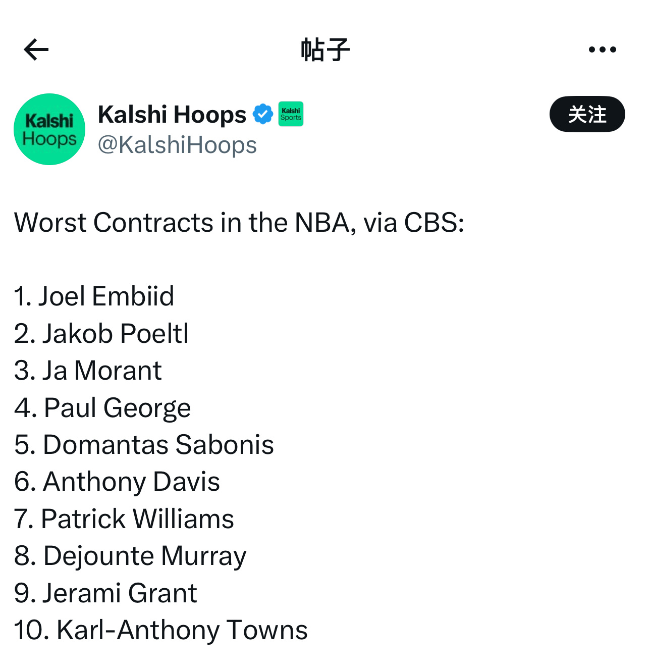 体育媒体CBS评选出NBA(现役)十大最差合同: