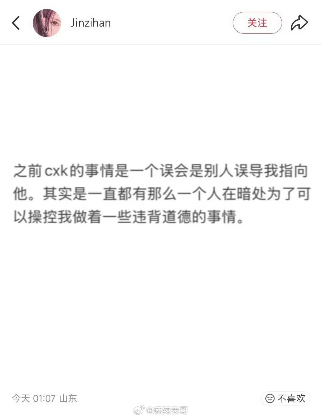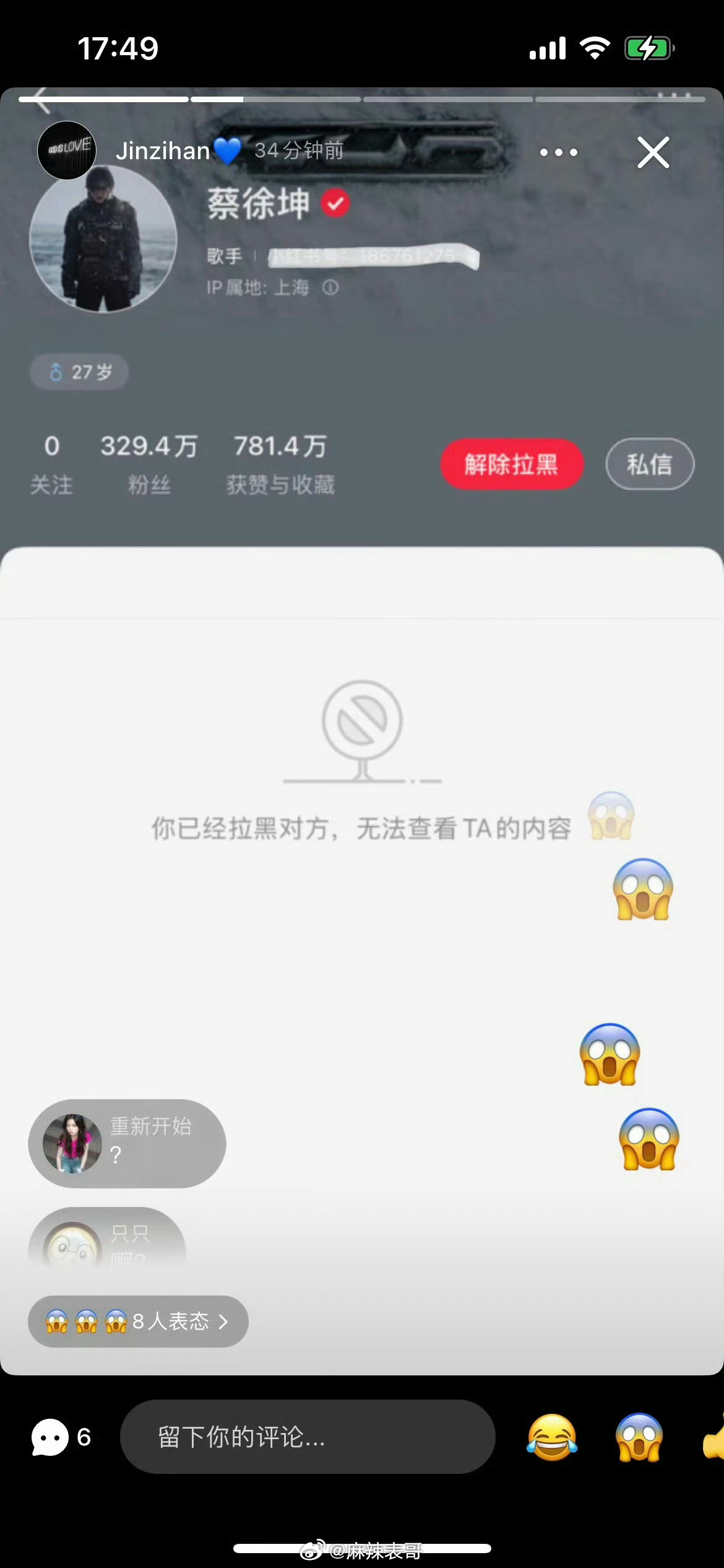 还说之前拉黑蔡徐坤,是别人误导的。