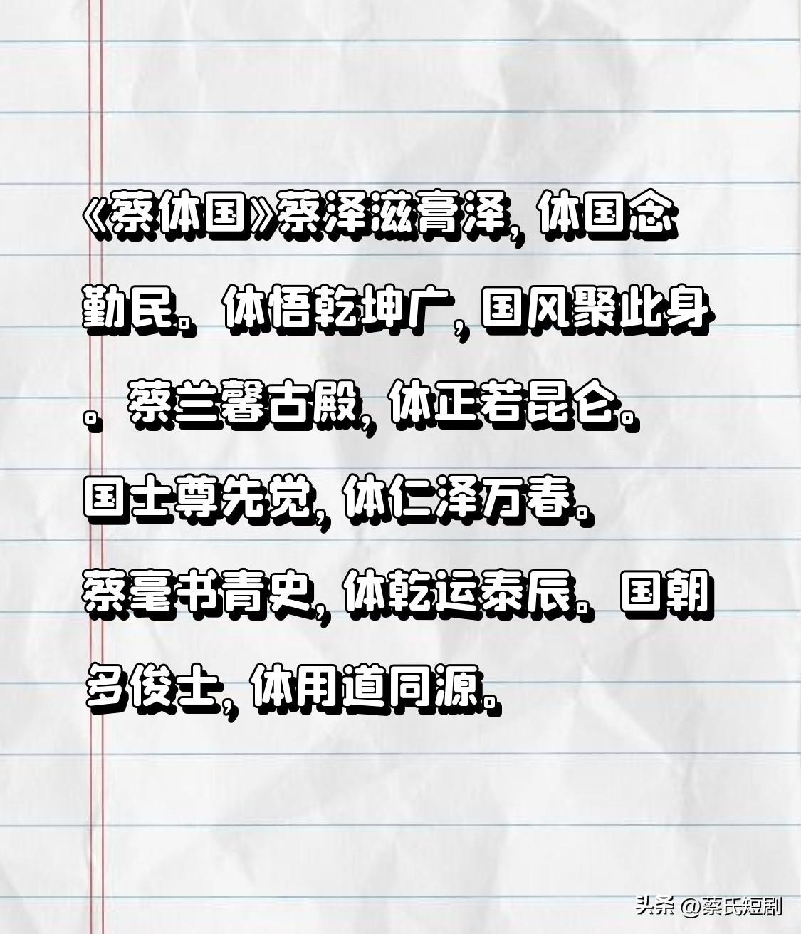 《蔡体国》 蔡氏滋膏泽,体国念勤民。 体悟乾坤阔,国风聚此身。 蔡兰馨古殿,体正