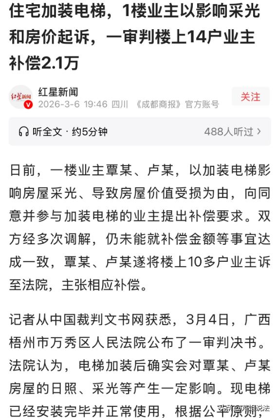 广西梧州,一对夫妻住一楼,楼上14户业主未经允许加装电梯,电梯建在夫妻家房屋东南侧,遮挡采光、影响通风,还致房屋贬值。夫妻俩多次协商,楼上业主起初给1万补偿,后经社区协调提到1.2万,但夫妻俩认为远不够弥补损失。沟通无果后,夫妻俩将14户业主告上法庭。法院审理查明电梯只在4楼及以上停靠,一楼用不上却要承担后果,高层业主应合理补偿,最终判决14户业主每户补1500元。 这老旧步梯房,一楼的夫妻覃某和卢某住了好些年,原本日子过得挺舒坦。 2022年,楼上业主不知从哪听说加装电梯有补贴,立马就张罗起来。 全程都没跟一楼夫妻商量过,完全没把人家感受当回事,我行我素,这操作简直太迷了。 电梯建好后,就在夫妻家房屋东南侧,又大又近,跟个庞然大物似的。 一楼采光本来就差,这下可好,被挡得严严实实,白天屋里都得开灯,不然啥都看不清。 通风也受影响,屋里又闷又热,那味都散不出去,住着别提多难受了,这谁能受得了。 而且房子还贬值了,本来好好的房子,就因为这电梯,价值大打折扣,搁谁身上不心疼。 夫妻俩肯定不乐意,多次找楼上业主商量,社区也帮忙调解。 夫妻俩觉得,自己受了这么大影响,补偿3万不算多吧,可楼上业主不干了,觉得这要求太过分。 一开始只给1万,后来在社区协调下,才勉强提到1.2万,这差距也太大了。 楼上业主也是,只考虑自己方便,加装电梯是好事,可也不能不顾一楼住户利益。 这电梯4楼以上才停,一楼根本用不上,凭什么要承担这些后果,这不是欺负人嘛。 这补偿金额也一直谈不拢,楼上业主觉得1.2万差不多了,可一楼夫妻觉得这点钱根本弥补不了损失。 双方谁也不肯让步,这矛盾越积越深,最后只能对簿公堂了。 楼上业主加装电梯,没考虑一楼住户利益,这到底该怎么算呢?难道一楼就只能吃哑巴亏吗? 从法律层面看,《民法典》第288条规定,不动产的相邻权利人应当按照有利生产、方便生活、团结互助、公平合理的原则,正确处理相邻关系。 楼上业主加装电梯,确实给一楼夫妻生活造成影响,像采光、通风还有房屋贬值这些。 虽说加装电梯是好事,但也不能只图自己方便,不顾别人权益,这明显不符合公平合理原则。 而且,《民法典》第296条规定,不动产权利人因用水、排水、通行、铺设管线等利用相邻不动产的,应当尽量避免对相邻的不动产权利人造成损害;造成损害的,应当给予赔偿。 楼上业主加装电梯,导致一楼房屋采光、通风受影响,还贬值了,这就造成损害了,按法律就得赔偿。 不管是加装电梯,还是其他涉及相邻关系的事,都得互相理解、互相协商。 不能只想着自己,得考虑别人感受,不然很容易引发矛盾纠纷,到时候还得闹上法庭,多麻烦。 还有这补偿金额,也得合理评估,不能一方狮子大开口,另一方又抠抠搜搜。 得根据实际损失情况,公平合理地确定补偿金额,这样才能让双方都心服口服。 最终,法院判决14户业主每户补1500元。 如果楼上业主一开始能多考虑一楼夫妻感受,好好协商补偿金额,也不至于闹到这一步。 现在好了,法院判决了,每户补1500元,虽然不多,但也是按法律来的,也算给这事画了个句号。 不过话说回来,这1500元真能弥补一楼夫妻的损失吗? 估计他们心里,还是有点憋屈。 做事得悠着点,别光图自己方便,得考虑别人,不然容易惹上官司。 这事大家怎么看,觉得这补偿合理不,欢迎各位针对本案,在评论区一起来留言讨论吧!