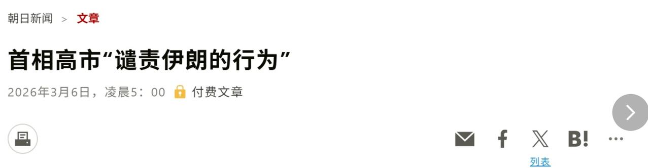 高市早苗谴责伊朗,要求伊朗保持克制。 连欧洲国家,都是要求双方克制,避免战争外溢。只有日本,单独点名伊朗。高市早苗的这一表态,连日本民众都看不下去。 除了高市早苗毫无逻辑的表态之外,日本还考虑协助美国在霍尔木兹海峡护航,据说是要派巡逻机和加油机。