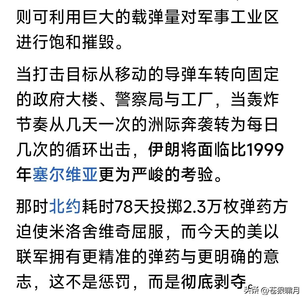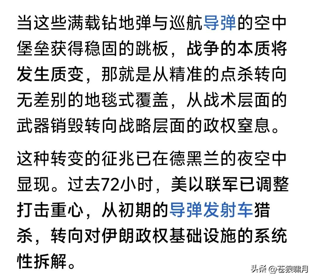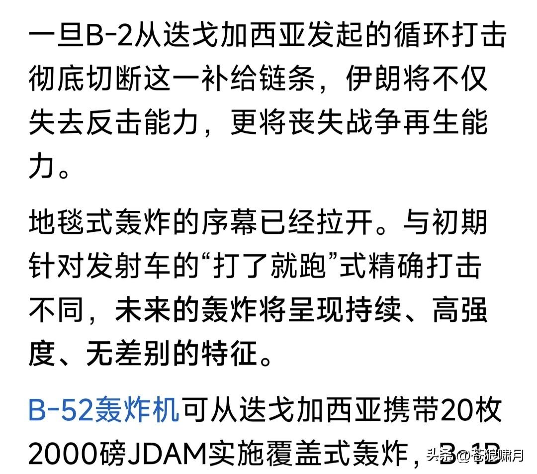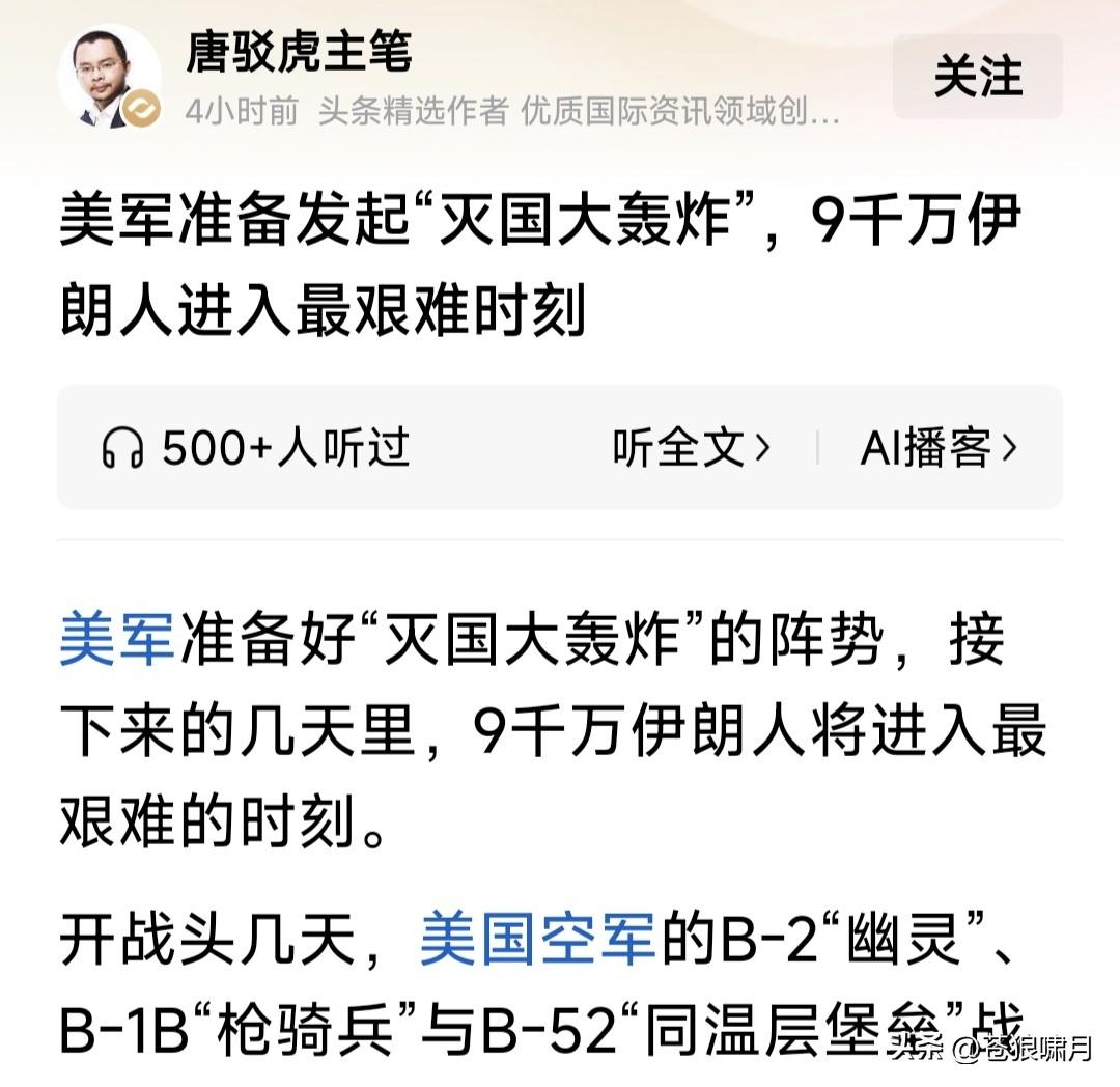 美以发起“灭国大轰炸”,伊朗9千万人进入“最艰难时刻”!看到此言吓一跳,再读网友文章,感觉确实如此。 美伊冲突已多天!自首日炸毁伊朗军政大楼,斩首哈梅内伊与众多高层,之后轰炸一直没停,主要摧毁防空系统与导弹发射装置,又取得明显成效。 媒体报道近两日,伊朗防空火力已基本沉寂,导弹与无人机发射数量,也较起初大幅度下跌。说明不是瞎说。 美防长赫格塞斯声称,美以已夺取伊朗制空权,各种战斗与轰炸机都可在伊朗全境自由飞行,扩大轰炸范围。 这些扩大范围有什么?省以下军政办公大楼,革命卫队驻地,导弹与无人机库及生产工厂,当然还有核设施。 此前担忧伊朗防空系统威胁,主要是以色列战机轰炸目标!现在伊防空火力基本哑火,美轰炸机开始上阵了! 美军远程轰炸机,最厉害是B-2幽灵,B-1B“枪骑兵”,B-52“同温层堡垒”战略轰炸机!是著名轰炸机三剑客。 B-2携带的重磅钻地弹,可穿透60米混凝土摧毁底下堡垒与军火库!B-52携带数十枚制导炸弹,可精准摧毁军政大楼与军事基地!B-1B携带的巨量普通炸弹,可轰炸核设施与军工厂! 目前伊朗虽遭重大损失,但革命卫队与“临时管理政府”仍没服软,表示要反击到底!美以开始全面轰炸,就是给伊朗“去军事化”。看你还如何反击? 美总统川普对美伊战局信心满满,已经在考虑“神权更替”之事!宣称伊朗新政府领导人,必须由他说了算。他的目标也许能实现,但不会那么容易? 眼观美伊冲突局势,苍狼有点焦虑! 无论什么战争,遭难的都是老百姓。还是停止冲突,用政治谈判解决分歧,再打下去,各方损失越来越大啊! 当然反侵略反恐战争除外,因是保家卫国,维护国家安全,人民责无旁贷。但美以打击伊朗,是什么性质呢? 关键是美伊冲突,是打击伊朗神权?还是侵略和干涉主权国家的内政?伊朗反击美以打击,是反抗侵略者?还是维护野蛮神权呢?这个谁能说得清? 不由想到美伊冲突的源头,与之牵连的两场战争:俄乌战争与以哈冲突! 如果说美以打击伊朗神权,是“侵略与干涉”!那发动俄乌战争者,是什么行为?伊朗神权长期扶持“巴也黎”的“哈真胡”反政府武装,是什么行为? 掰扯不清啊!网友给评评理吧? …………