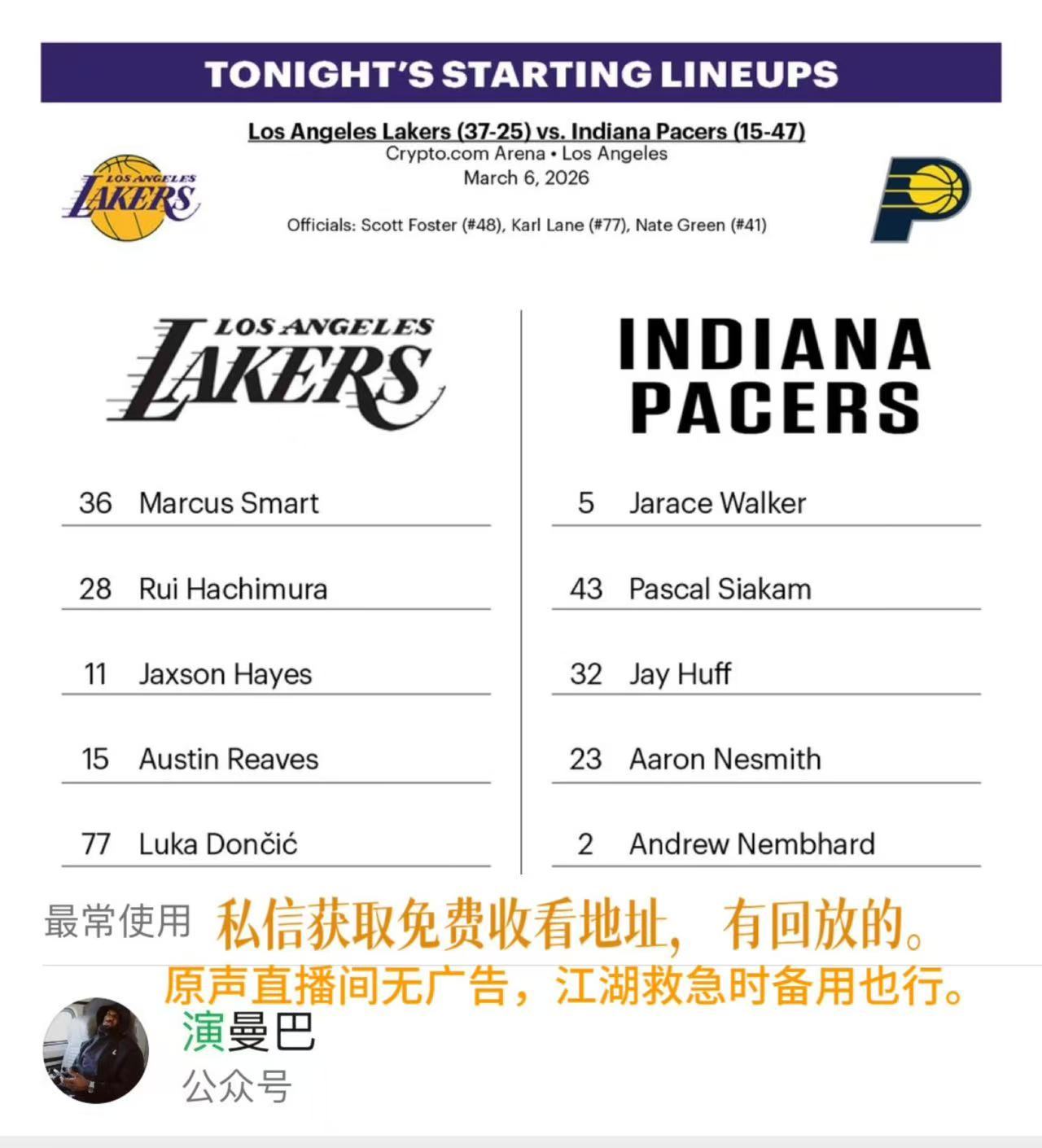 湖人步行者首发名单:东契奇、里夫斯、斯玛特、八村塁、海斯内姆哈德、内史密斯、沃克、西亚卡姆、赫夫