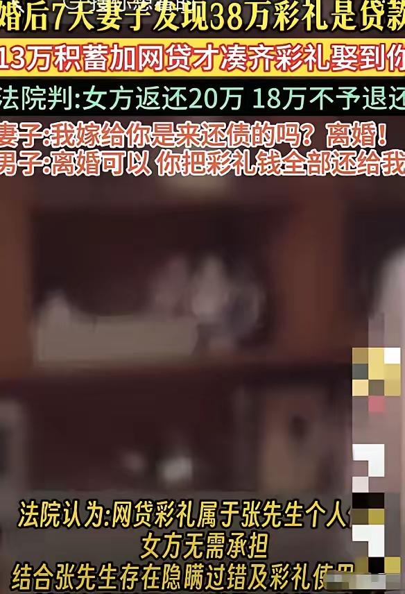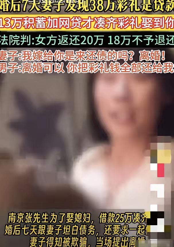 彩礼背后是算计 结婚才七天,男的摊牌了。三十八万彩礼,二十五万是贷款。他以为生米煮成了熟饭,妻子会认。结果妻子当场就要离婚。 男的马上变脸。要离婚,就得把彩礼全退回来。 事情闹到法院,判决有些特别。女方没有全退,还了二十万。剩下的钱,办婚礼花掉了。 这不是钱的事。一段婚姻的开始,就布满了谎言和债务。男方觉得骗到手就安全了,却不知信任一旦碎了,就捡不起来。女方觉得被骗是委屈,可当初要的那份高额彩礼,何尝不是一种压力。 两个人的结合,还没开始生活,就已经在盘算各自的得失。一个用借钱来撑门面,一个用彩礼来求保障。唯独少了点真诚。 日子是两个人往后过的,不是靠一笔钱锁死的。算计来的婚姻,开头就错了。