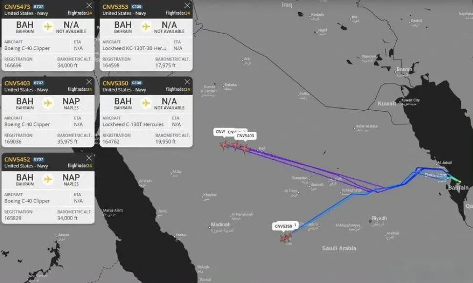 4架美军C-40(军用版波音737-700)和1架C-130T从巴林起飞,飞越沙特领空。都是些C字头的运输机,可能是驻巴林的美军怕继续被伊朗炸,于是向后撤。