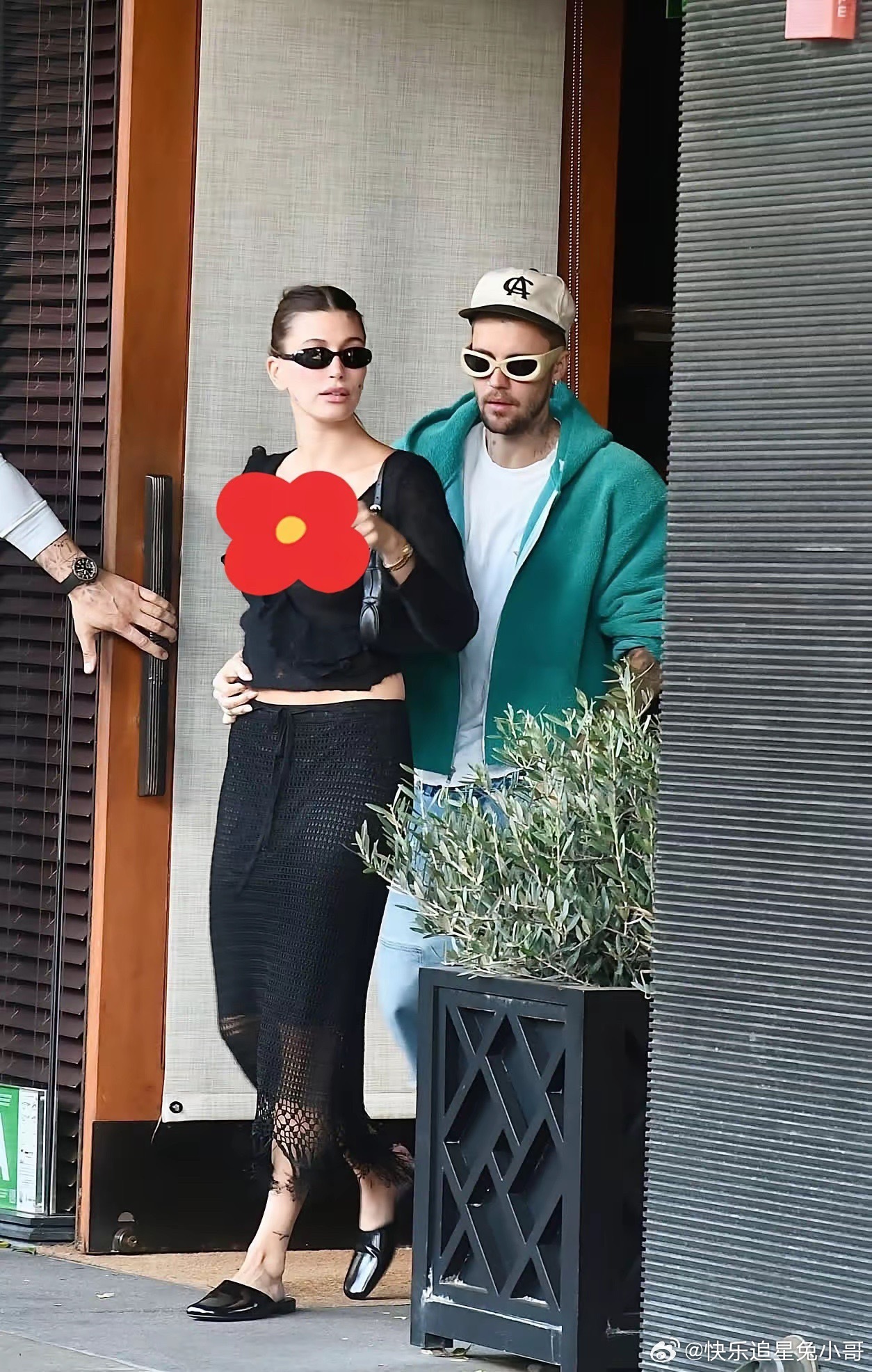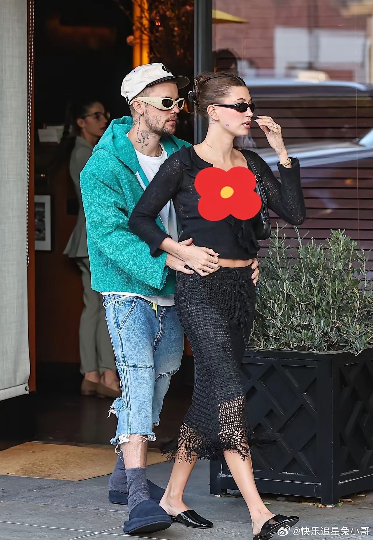 贾斯汀·比伯与妻子海莉·比伯在比佛利山的南比佛利牛排馆共进午餐后,被拍到紧紧相随