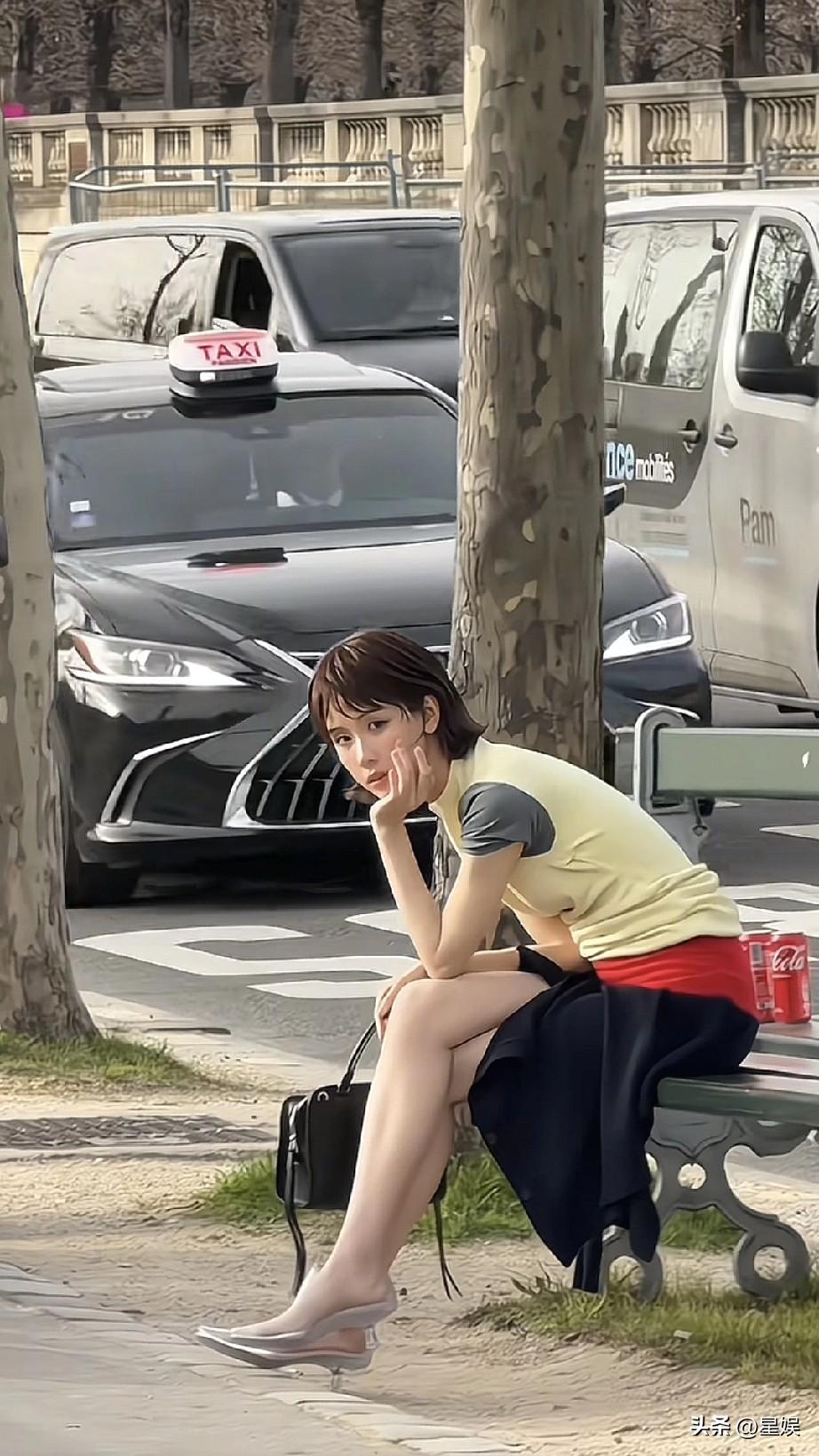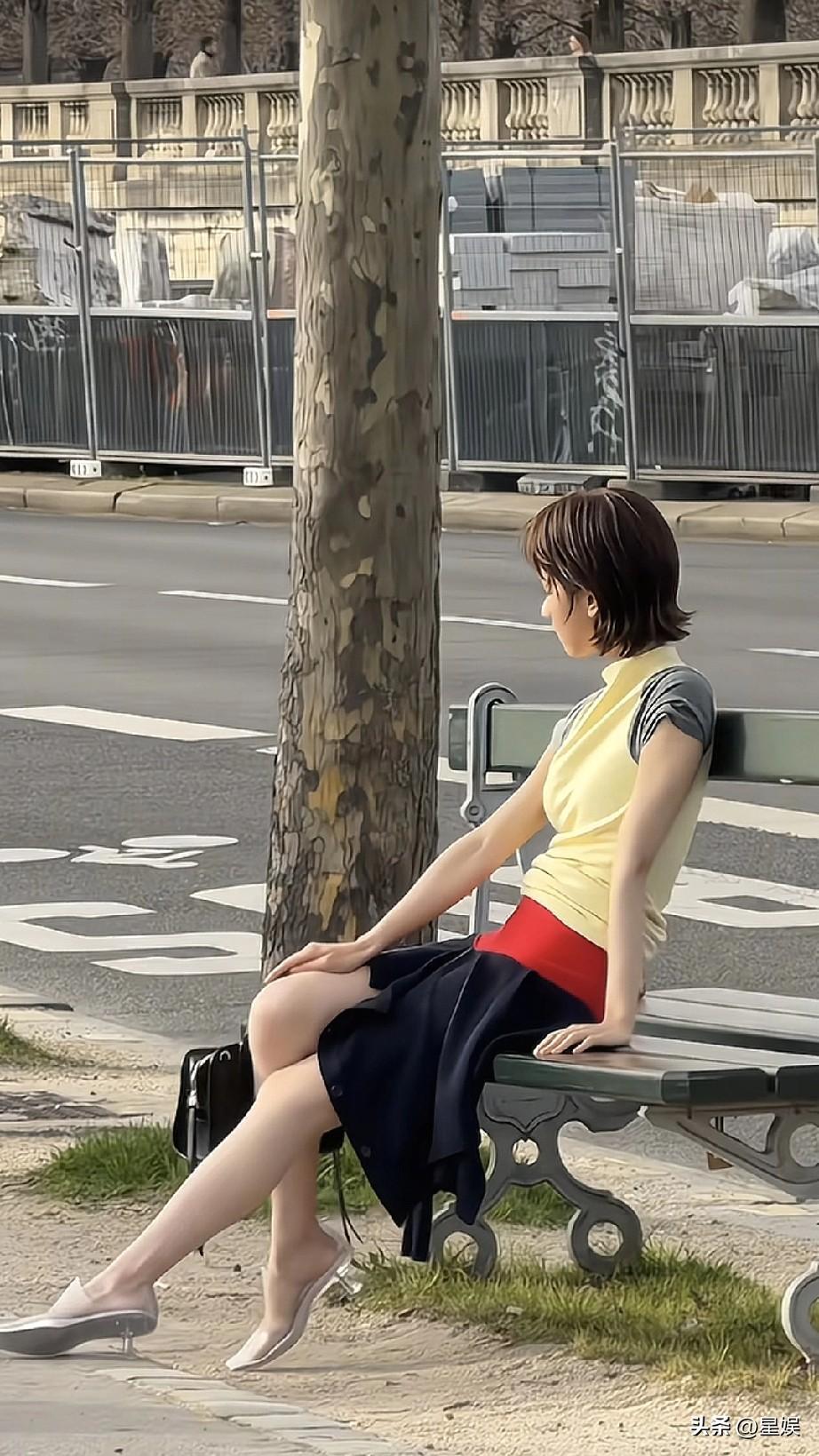 陈都灵坐在路边长椅上