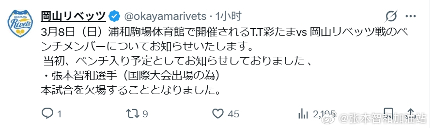 日本乒乓球t联赛张本智和 张本智和不参加3月8日(周日)的T联赛比赛。“3 月 8 日(日)于浦和驹场体育馆举办的 T.T 彩玉对阵冈山铆钉的比赛,替补名单通知如下。此前公告的替补人选中,张本智和选手(因参加国际赛事)将缺席本次比赛。”(机翻)Cr: 冈山
