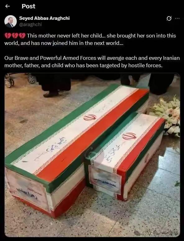 伊朗外长阿拉格齐发了一条推文,配图是一大一小两口棺木,里面是被炸死的妈妈和她的孩子。 阿拉格齐在这条推文下附上了一句直白的文字,这位母亲从未离开她的孩子,她将儿子带到这个世界,现在已与他一同进入另一个世界。没有渲染情绪,没有刻意煽情,短短一句话配上冰冷的画面,却让所有看到的人瞬间破防。这条推文发布的时间点,正是加沙地带人道主义危机持续恶化、中东地区冲突范围不断扩大的关键阶段,阿拉格齐选择用这样的方式发声,不是简单的外交表态,而是对无数平民死于战火的直接控诉。 截至2026年3月2日,本轮巴以冲突已经造成加沙地带72097人死亡,171796人受伤,死者里超过七成是妇女和儿童,仅儿童死亡人数就突破21000人。这些数字不是冰冷的统计数据,是一个个像推文里一样的家庭,是母亲失去孩子、孩子没能长大的真实悲剧。加沙地带365平方公里的土地上,90%的民用基础设施被摧毁,没有一家医院能完全正常运转,粮食、药品、饮用水的短缺让平民的生存难以为继,饥饿和低温都在持续夺走儿童的生命,仅2026年冬天就有11名儿童因体温过低离世。 我们总在新闻里看到冲突的进展,看到各方的军事行动,却很少有人关注到战火下最无辜的平民群体。这对离世的母子,没有参与任何武装对抗,只是守在自己的家园里,却没能躲过无差别的袭击。加沙的平民没有安全的避难场所,没有畅通的撤离路线,连最基本的生存保障都无法获得,他们的苦难,本该被全世界看见并重视,却长期被部分舆论刻意淡化。 国际社会对这场冲突的态度一直存在明显的双重标准,部分国家一味强调军事行动的合理性,却对平民的大量伤亡视而不见,对加沙的人道主义危机置若罔闻。救援通道多次被关闭,人道主义物资无法顺利送达,饥饿和伤病在加沙地带肆意蔓延,这样的局面,完全违背了最基本的人道主义准则,也践踏了人类文明的底线。我们不禁要问,冲突持续至今,到底谁来为这些无辜平民的死亡负责?为什么妇女和儿童总要成为战争最直接的受害者? 阿拉格齐的这条推文,没有使用任何复杂的外交辞令,却用最真实的画面打破了信息的壁垒。他想让全世界看见,战争带来的不是胜负,是家庭的破碎,是生命的消逝,是母亲和孩子永远无法重逢的遗憾。从加沙到伊朗近期遭袭的小学,无辜平民尤其是儿童的伤亡事件接连发生,这不是偶然,是冲突不断升级带来的必然恶果,是漠视生命带来的沉重代价。 每一个平民的死亡,都是对人类良知的拷问。冲突从来都不该以牺牲无辜者为代价,保护妇女儿童、保障平民安全,是所有国家和势力都必须坚守的底线。国际社会不能再继续沉默,不能再放任冲突不断扩大,推动各方立即停火、全面开放人道主义救援通道、严格保护民用设施和平民安全,才是当下最该做的事。 这条推文会被更多人转发,这对母子的悲剧会被更多人铭记,我们只希望这样的画面不再出现,希望每一位母亲都能守护孩子平安长大,希望每一个生命都能被尊重和善待。 各位读者你们怎么看?欢迎在评论区讨论。