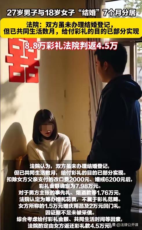 这个案例涉及彩礼返还的法律适用、婚姻年龄、双方的责任分担等多个层面,具有一定的典型意义。以下是一些重点分析和看法,供参考: 1. 法律层面: 根据民法典及相关司法解释,彩礼返还主要考虑三种情形: 双方未办理结婚登记; 办理了婚姻登记但未共同生活; 婚前给付彩礼导致给付人生活困难。 本案中,许某和文某未领证,属于未办结婚登记的情况,符合法院支持返还彩礼的条件。 但二人已同居7个月,有共同生活的事实存在,这本应在返还数额上予以权衡。 2. 彩礼性质与金额认定: 法院剔除了喜糖礼盒(6600元)和烟酒费用(1.76万元)等不属于彩礼的支出,认定真正的彩礼为7.98万元左右。 此外,许某提出的回门费用和婚庆用品支出等均未有有效证据支持,故法院未予采纳。 这样的认定相对客观,既保护了男方的财产权,也体现了对女方实际支出的合理考虑。 3. 关于信用和证据: 许某签署了欠条及返还协议,法院认定其系真实意思表示,排除了被胁迫的主张。 这告诉我们,在涉及重大经济往来时,书面协议和证据非常关键。 4. 返还金额的合理性: 虽然一开始文某要求返还全额88000元,但法院基于实际彩礼金额和双方共同生活时间,酌情判定许某返还4.5万元。 对许某来说,这个数额既体现出对她实际付出的尊重,也兼顾文某的权利要求。 从实际效果来看,这个判决较为公平,既避免了许某因未登记结婚被要求返还全部彩礼的苛刻,也保护了文某的合理期待。 5. 社会和道德层面: 18岁的许某对婚姻缺乏成熟认知,且选择了工作不稳定的文某,很可能存在冲动和盲目。 两人的年龄差9岁,在女方尚未成年时匆忙进入婚姻或同居,不免引发多方面的复杂问题——身体、情感、经济甚至法律责任。 彩礼及婚姻的处理,更应本着善意和相互尊重,避免年轻人的草率决定变成长期负担。 6. 个人建议与社会启示: 年轻人结婚应理智考虑,不能盲目从众或急于求成,多沟通了解彼此,理清经济责任和未来规划。 家庭和社会也应加强对青少年的婚恋教育和支持,避免类似纠纷频发。 彩礼问题应理性对待,尤其当婚姻未登记时,要有明确法律意识,避免财务纠纷。 总结: 法院判决返还4.5万元彩礼,既尊重了法律规定,也体现了对双方实际情况的综合考量。我个人认为,这个判决结果较为合理,不偏向任何一方,保护了双方的合法权益。 至于“彩礼是不是退得多了还是少了”,因彩礼具有一定的习俗性质、当地经济水平及双方经济状况均不同,很难有绝对统一标准。但从本案细节来看,法院裁量较为公正。 欢迎大家对这件事发表看法,特别是年轻人如何更理智面对婚姻和彩礼问题,是值得深思的社会话题。彩礼差异大 彩礼危害 彩礼差异
