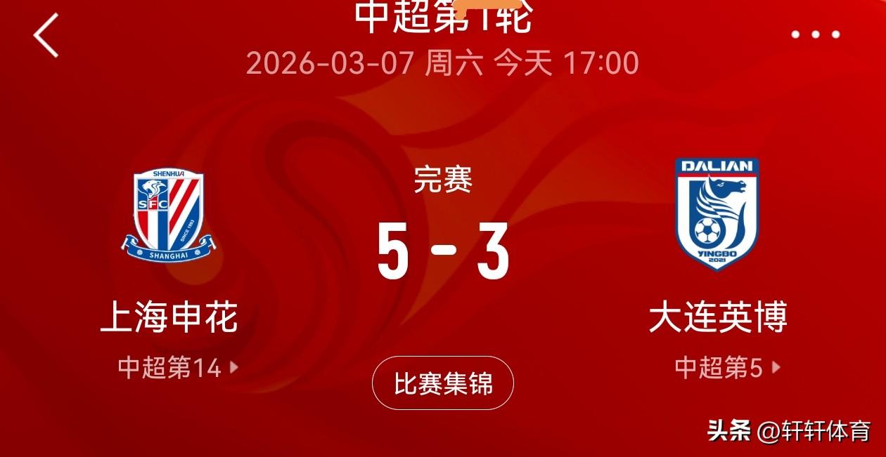 大连英博26赛季中超首轮以3-5不敌上海申花,可以说全场比赛打出了英博应有的实力,大连英博作为中超二年级新生,能够在首轮客场打进三球足以证明其攻击力还是很优秀的,但是相对较弱的就是防守本场比赛5次被申花外援攻破,大连英博本赛季球队总身家803万欧元,上海申花1517万欧元,身价相差很大所以本身阵容配置的硬实力就不如上海申花,输球也不气馁回到主场赢回来就好,大连英博本赛季前5轮是相当魔鬼的,但是前5轮如果能够挺过去,后面球队随着磨合的深入,相信球队一定会越打越好的。