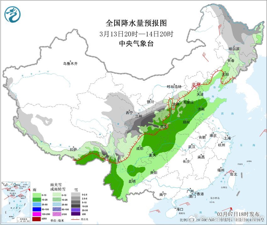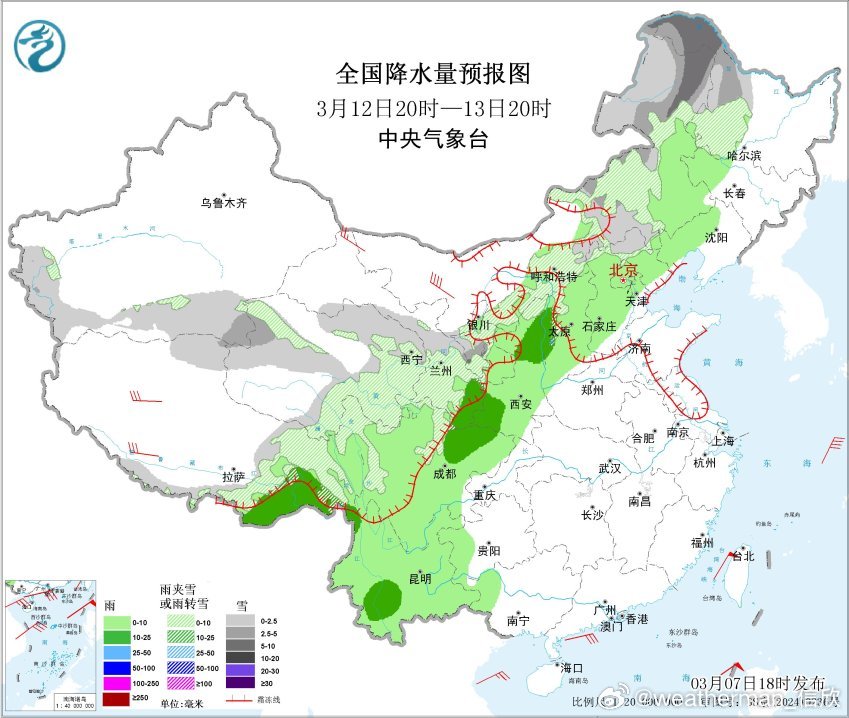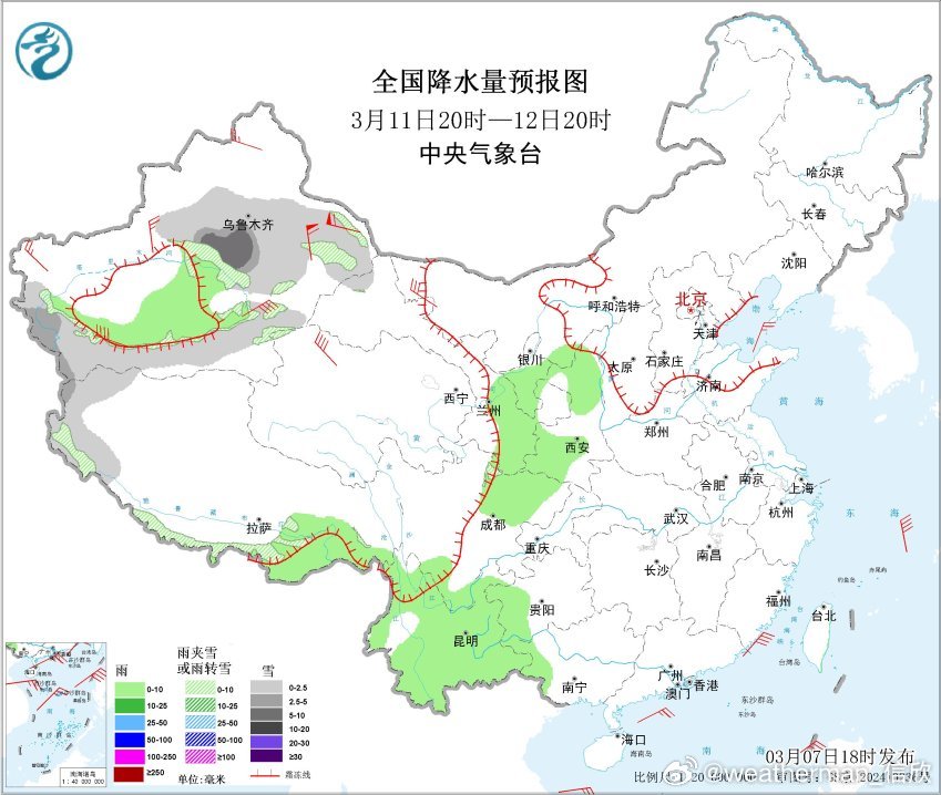 10日南方的降雨减弱南压,10-12日我国总体的降水少,晴天多。但之后因为冷暖空气交汇,还有大范围降水。10日晚-12日晨,新疆西部和北部有明显降雪。因为这股冷空气是西路冷空气,自带水汽,新疆部分地区有大雪-暴雪。13-14日冷空气到了中东部,又有明显暖湿气流配合,雨雪范围、强度也不可小觑。