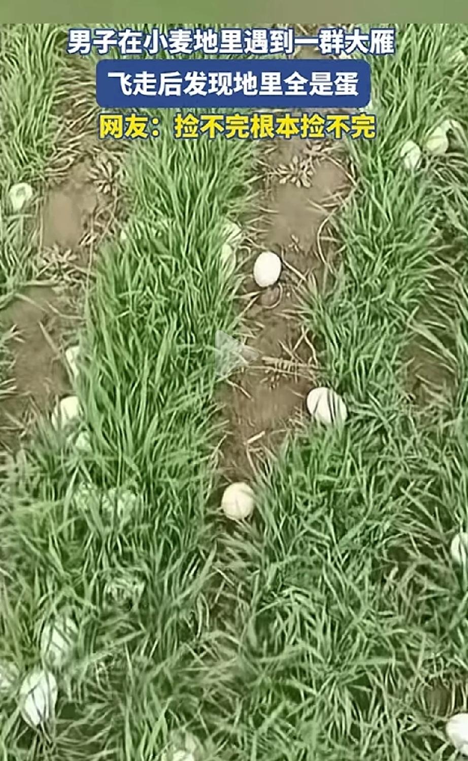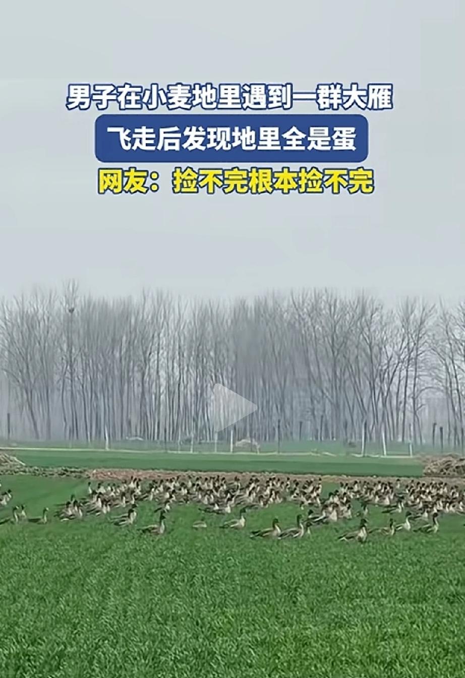 发财了!河南,一名男子在小麦地里遇到一群“大雁”,等它们飞走后,有走近麦发现地里藏着好多蛋,网友直呼:捡不完根本捡不完! 这天,男子路过一片小麦地,突然看到一群长得像大雁的鸟落在地里,叽叽喳喳的特别热闹。 他没敢靠近,就在旁边远远看着,过了一会儿,这群鸟扑棱着翅膀飞走了。 等鸟群飞远后,男子好奇地走进地里查看,一下子被眼前的景象惊到了:小麦苗之间,散落着好多椭圆形的蛋,密密麻麻的,一眼望不到头。 但很快就有懂行的网友科普:这些鸟不是野生大雁,而是养殖的雁鹅,平时大家说的“铁锅炖大雁”,其实炖的就是它。 我特意去查了查,在法律上,咱们通常说的大雁,比如鸿雁、豆雁,大多是国家保护的“三有”保护动物(就是有重要生态、科学、社会价值的陆生野生动物)。 而且,法律上说的野生动物,不光是那个活物,连它的蛋、它的卵,甚至尸体都算在内。 所以,捡大雁蛋,在法律上的性质,跟你去抓大雁没啥区别,都属于非法猎捕,是违法的!多地都出台过规定,禁止捡拾鸟蛋、破坏鸟巢。 有网友说“差点以为能捡来尝鲜,原来不能碰” 说实话,看到满地的蛋,说不动心那是假的。但心动归心动,咱手可得管住了。这满地白花花的蛋,看着是“泼天的富贵”,但弄不好就是“泼天的官司”。为啥这么说? 第一,这很可能是大雁临时把蛋下在这儿,人家还得回来孵呢。你把蛋捡走了,就等于断了人家一窝的后,这窝大雁今年的繁殖就全泡汤了,这是造孽啊。 第二,退一万步讲,就算这是养殖的“雁鹅”,那也是别人的财产,咱也不能随便捡啊。 第三,也是最关键的,如果是野生大雁的蛋,捡了就是违法。为了口吃的,背上个违法记录,值当吗? 随着咱们国家的生态环境越来越好,像这样野生动物“闯入”咱生活的稀罕事会越来越多。过去咱们穷怕了,看见啥都想往家搂。但现在日子好了,想法也得跟着变。