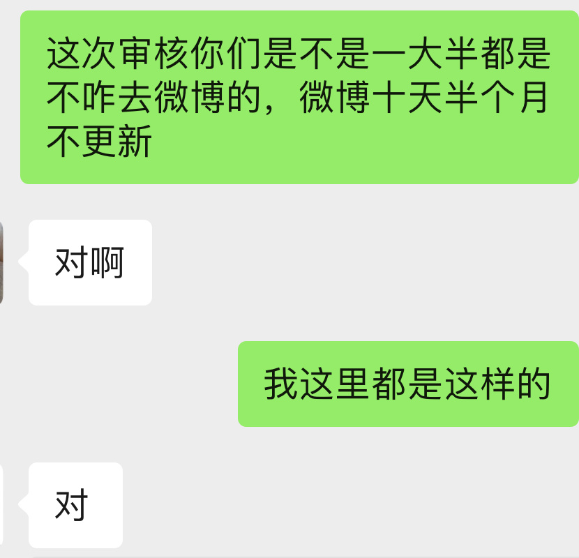 因为是先让大家进微信群在一对一审核进区域群,进区域群有一个必要条件是给id,一起审核的姐妹统一发现审核过的几千个ibo一大半十天半个月不来微博玩了。