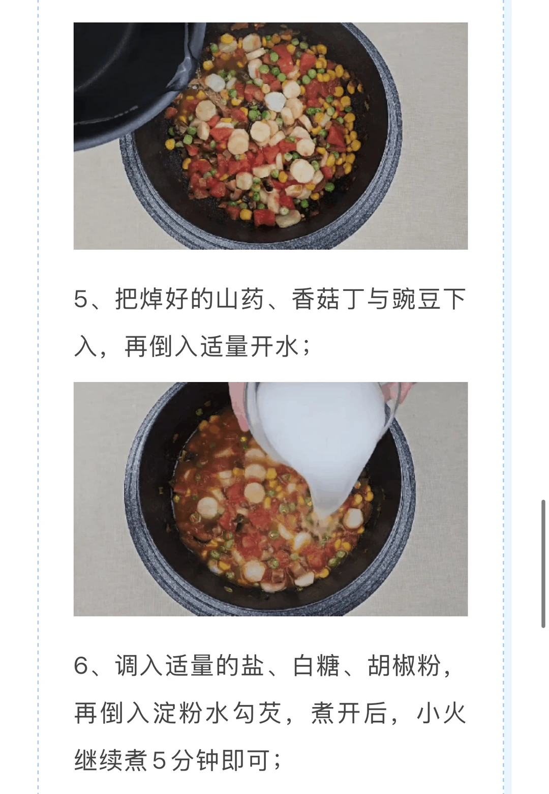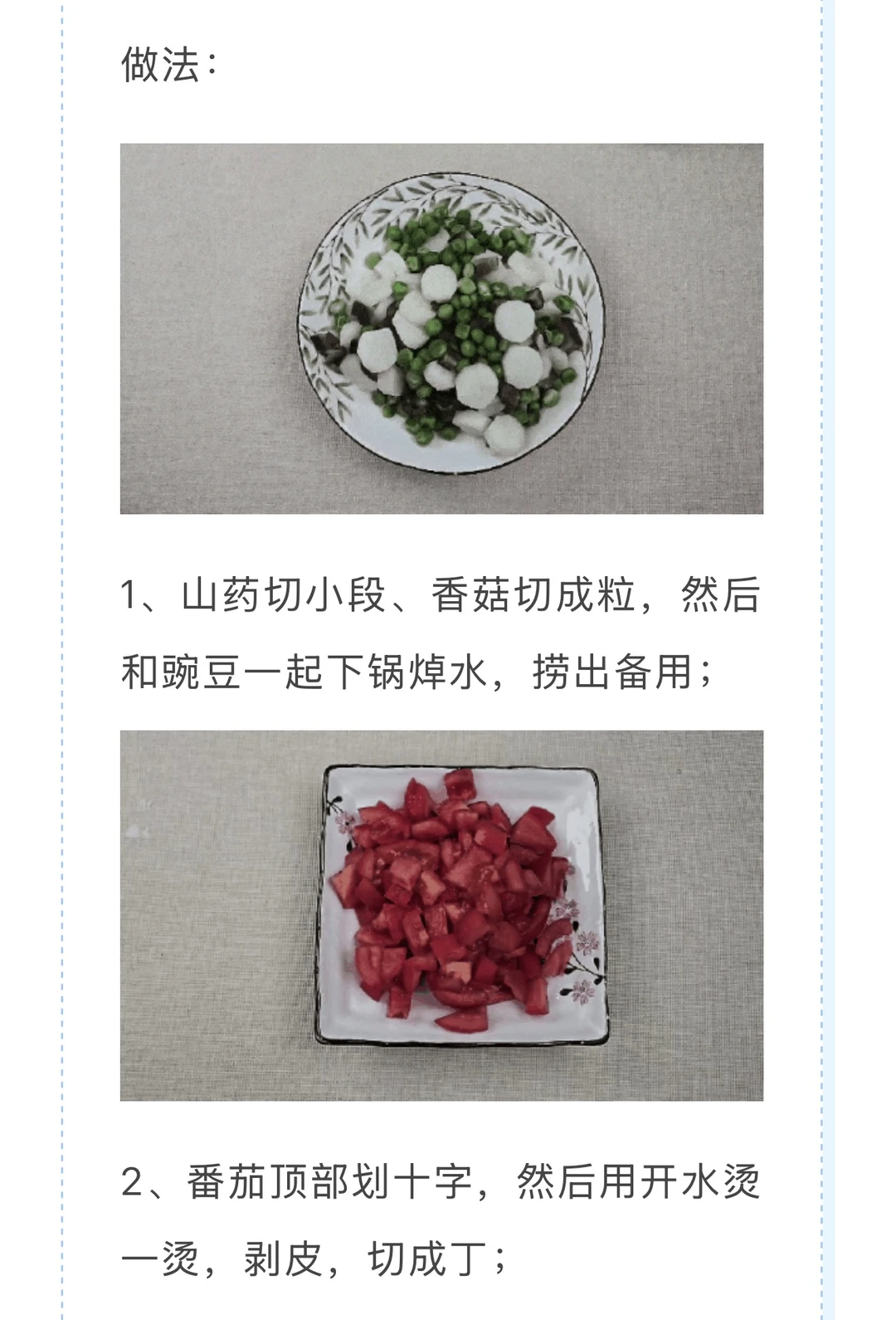[星R]原料:铁棍山药200g、玉米粒100g、豌豆100g、香菇5朵、番茄1个、葱花、淀粉、盐、白糖、胡椒粉