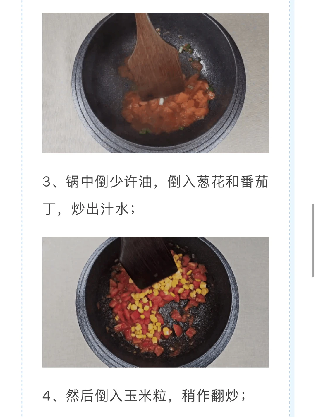 3.锅中倒少许油,倒入葱花和番茄丁,炒出汁水;