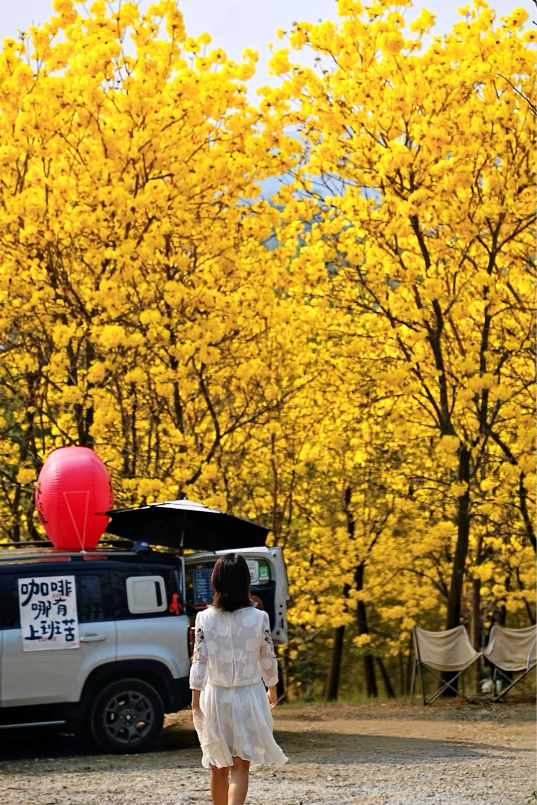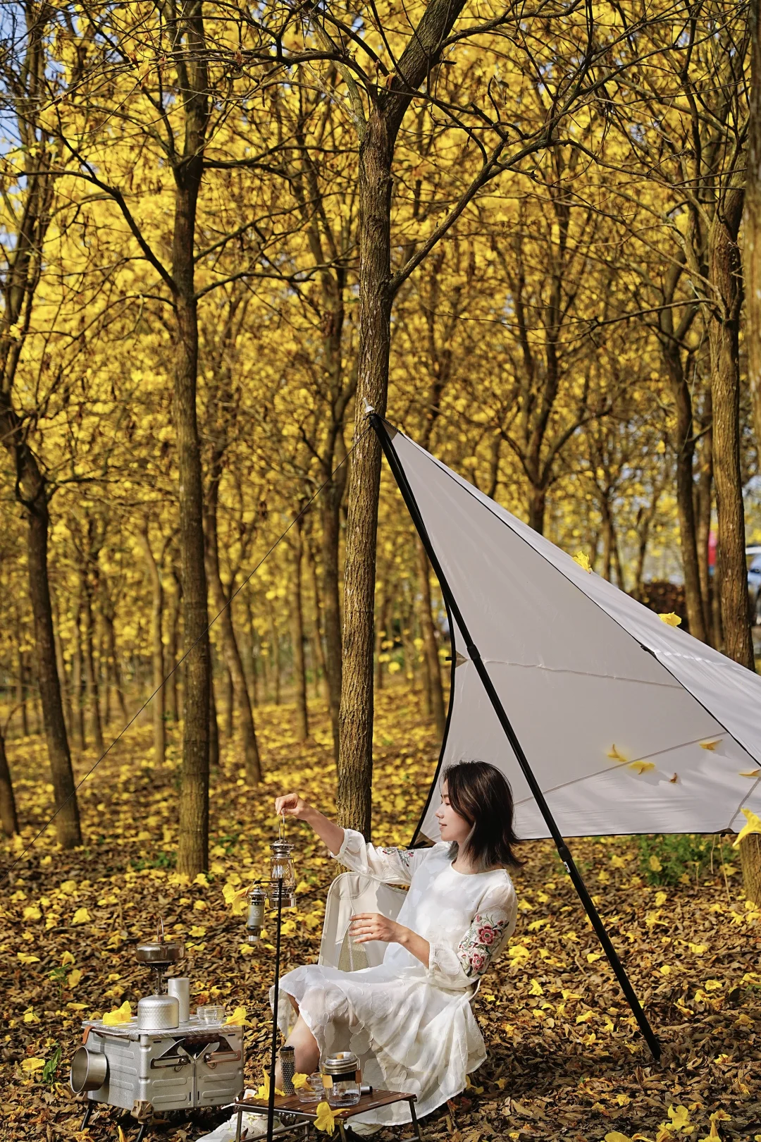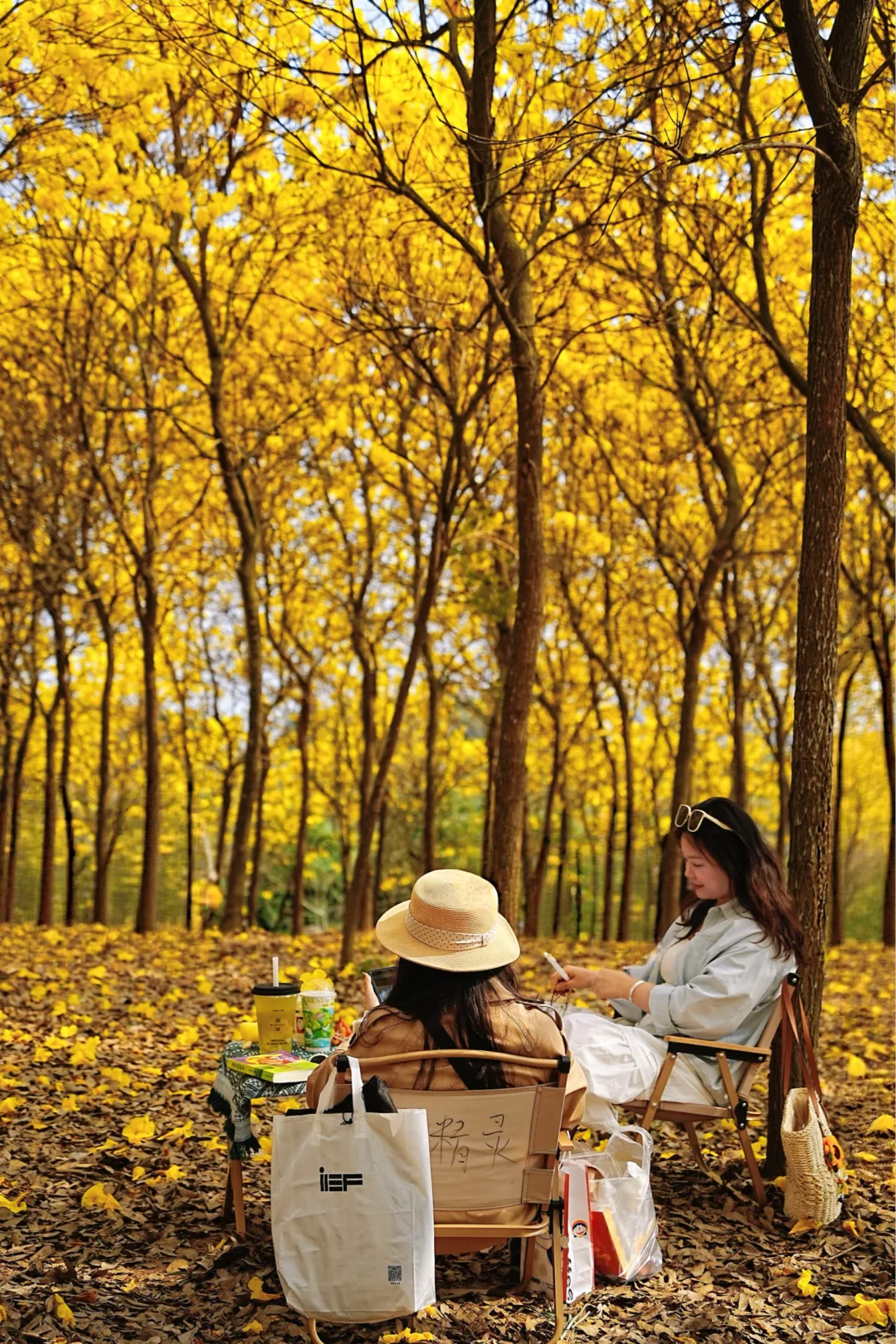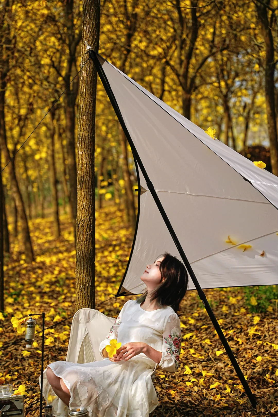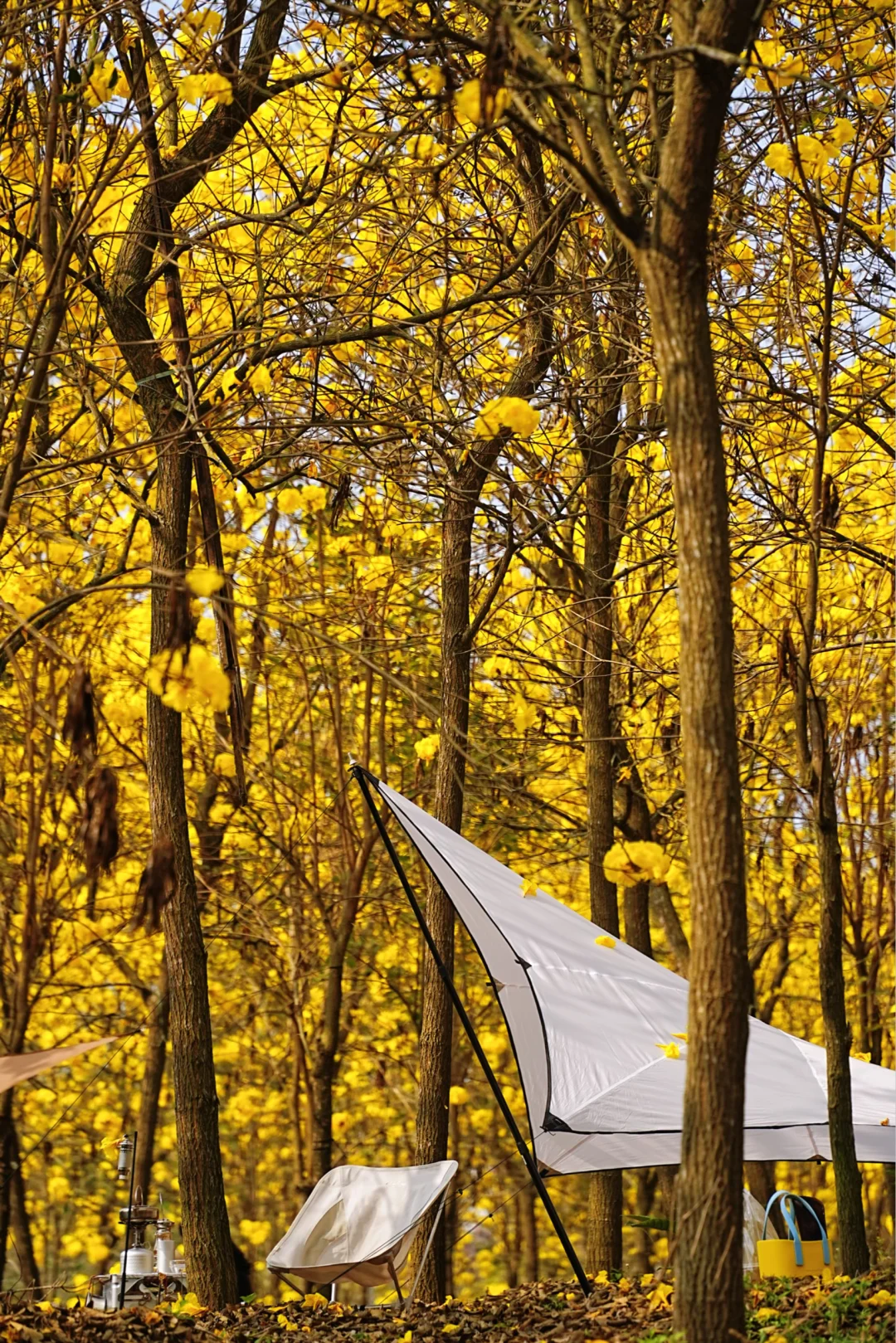 5️⃣我下午三点多到的,阳光刚好洒进花林里,金色花瓣blingbling的。树下简易搭个露营装备坐着发发呆,风吹过的时候花瓣飘下来,那一刻真的觉得人生没白活!
