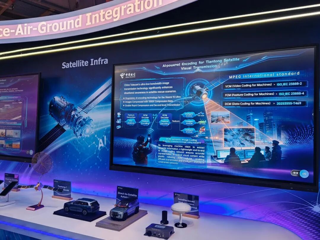 中国电信在现场展示了全球首个AI图像编码标准——DCM语义编解码技术,它能将任意高清图像极限压缩至4KB以内。我们都知道,高轨卫星的优势覆盖面广,劣势则是速率低,通常只应用于语音、短信领域,主打应急场景。