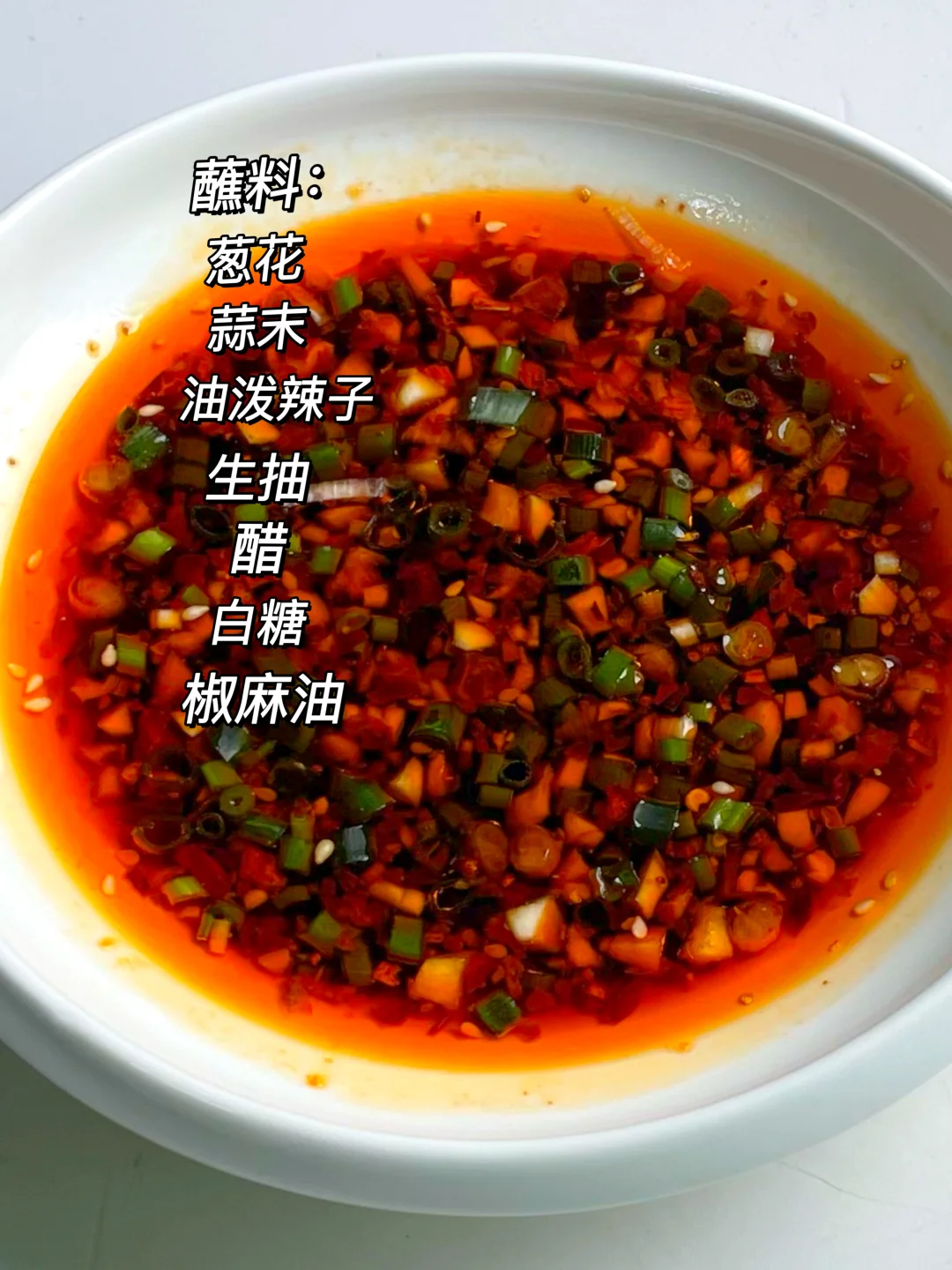葱花+蒜末+油泼辣子+生抽+醋+白糖+椒麻油