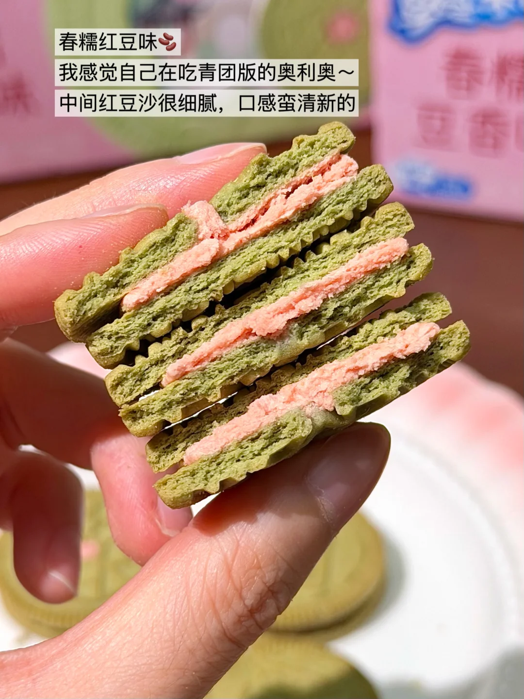 夹心是红豆味的!很清新!有点像在嚼细腻的红豆沙
