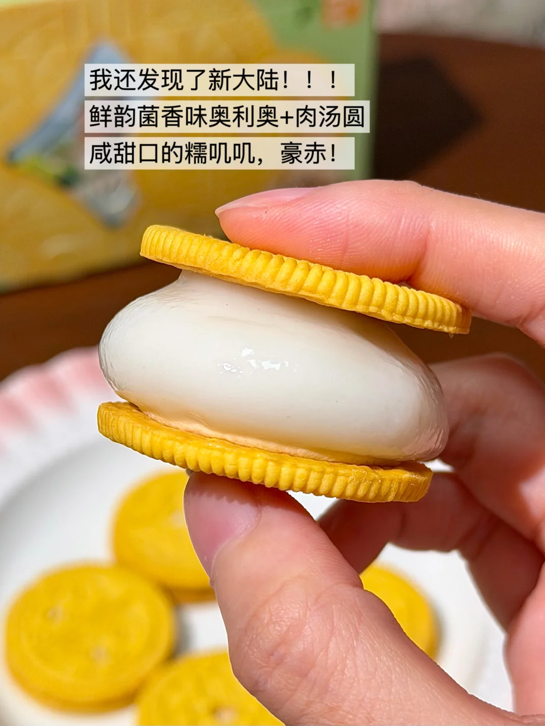 🤣我突发奇想了下,用菌香味的奥利奥夹上南方人爱吃的肉汤圆,咸甜口的,而且吃着外脆里糯,越吃越上头……