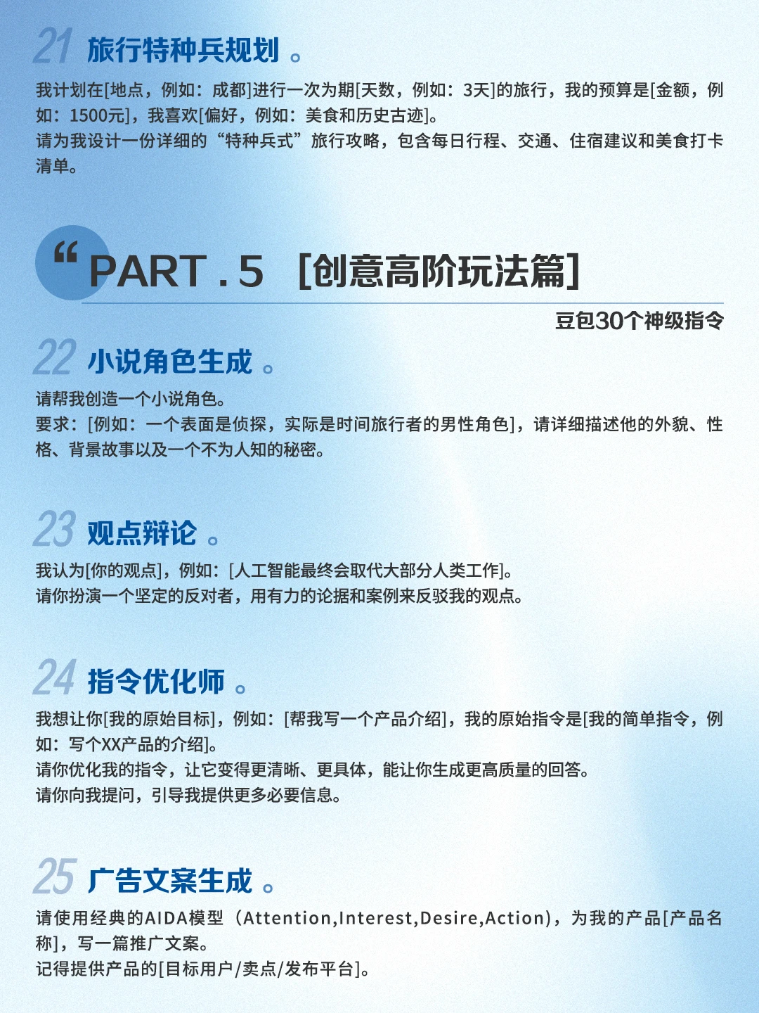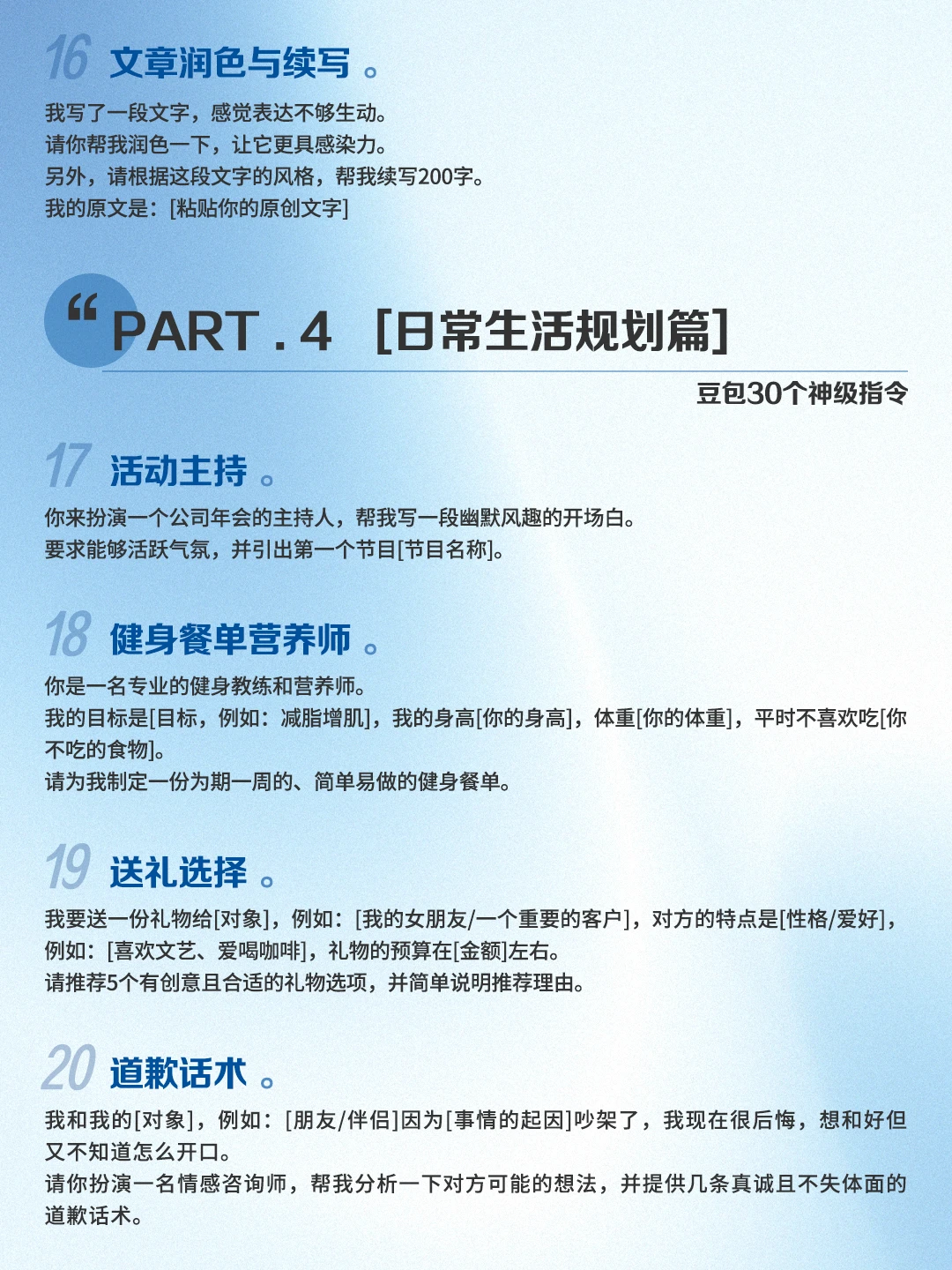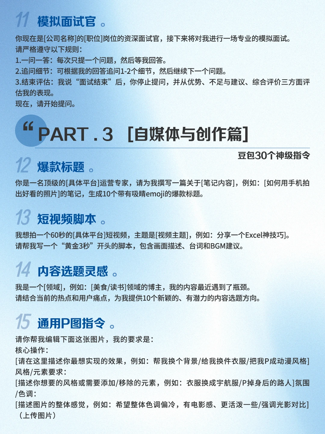 谁还在瞎用豆包啊[捂脸R]别嫌它听不懂需求是人工智障,要找对正确的“唤醒方式”[偷笑R] 整整30个豆包快速指令[向右R]覆盖五大高频场景,不用费脑想话术,直接复制就能用! 职场办公(周报、邮件、会议纪要全搞定) 学习考试(计划、论文、知识点拆解) 自媒体创作(标题、脚本、选题灵感) 日常规划(送礼、旅行、健身餐) 创意玩法(文案、角色、辩论) 全场景适配!每个指令都给好了完整引导逻辑,不用自己琢磨怎么提问,直接填空就能用,省下来的时间摸鱼不香嘛!