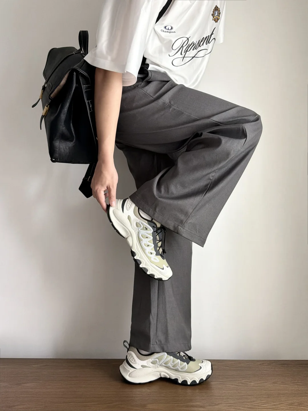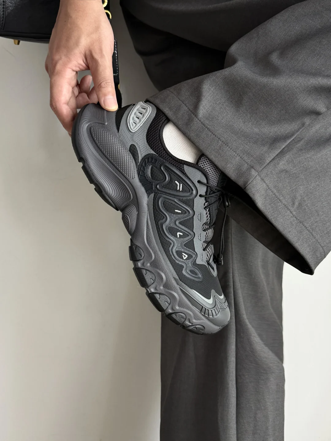 野鸽灰是那种高级感拉满的黑灰调,全鞋暗纹压印,像把工业风穿在脚上,