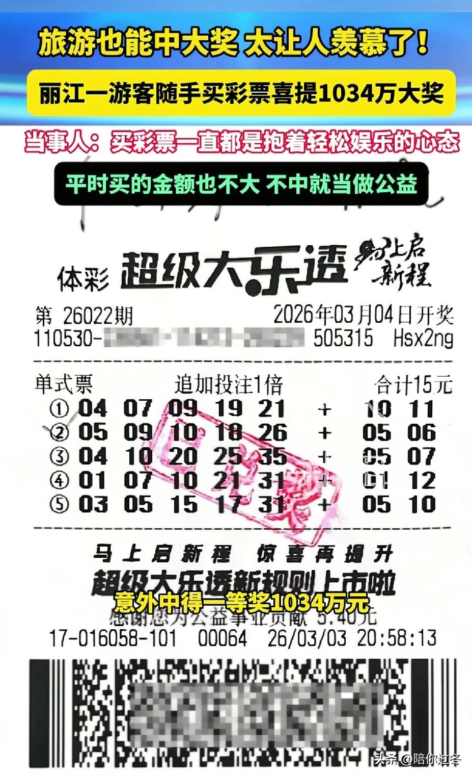 男子丽江旅游中1034万元大奖![震惊] 出门旅个游,随手就中了一千多万,从普通人直接变成大富豪,好运来了真是挡都挡不住呀!还能说什么了,只有眼睁睁的羡慕了哟![呲牙] 近日,据九派新闻报道,周先生这次专门到云南丽江来旅游的,看看美丽的雪山,逛逛古城,感受一下当地的风俗人情。 当天他在丽江闲逛时,路过一家体彩店,于是便随手买了几注,当时也没多想,纯属当作娱乐消遣。 没想到中了千万大奖,当时自己都不敢相信,经过再三确定才知道是真的,他激动的说丽江是自己都幸运城市,给他带来了好运。 周先生还透露平时也会买彩票,但都是小金额的购买,纯当作是娱乐,不中奖也就当作做公益,这次中奖完全就是运气好而已。 彩票就是纯概率游戏,跟是不是特意算守号,研究走势没多大关系,反而越随意越随缘的人,越容易出现在中奖新闻里,有人无心插柳,有人精算一场空!祝大家好运!云南彩民中大奖