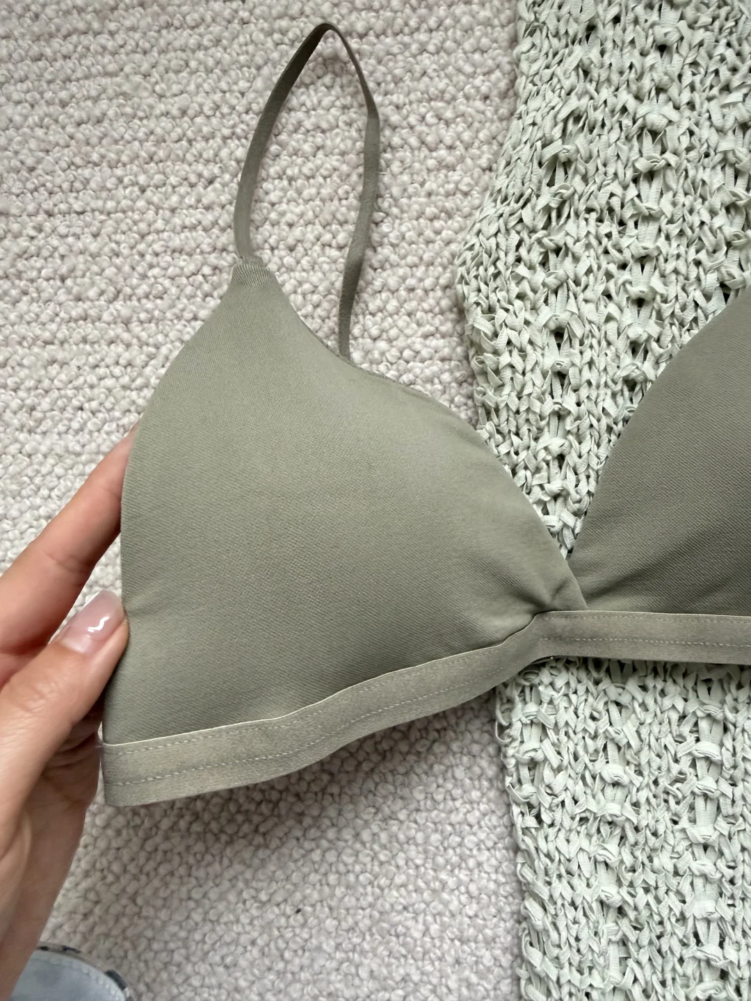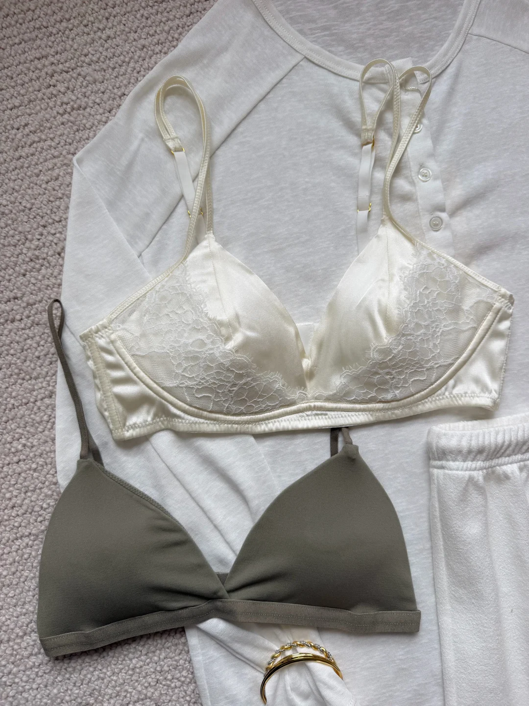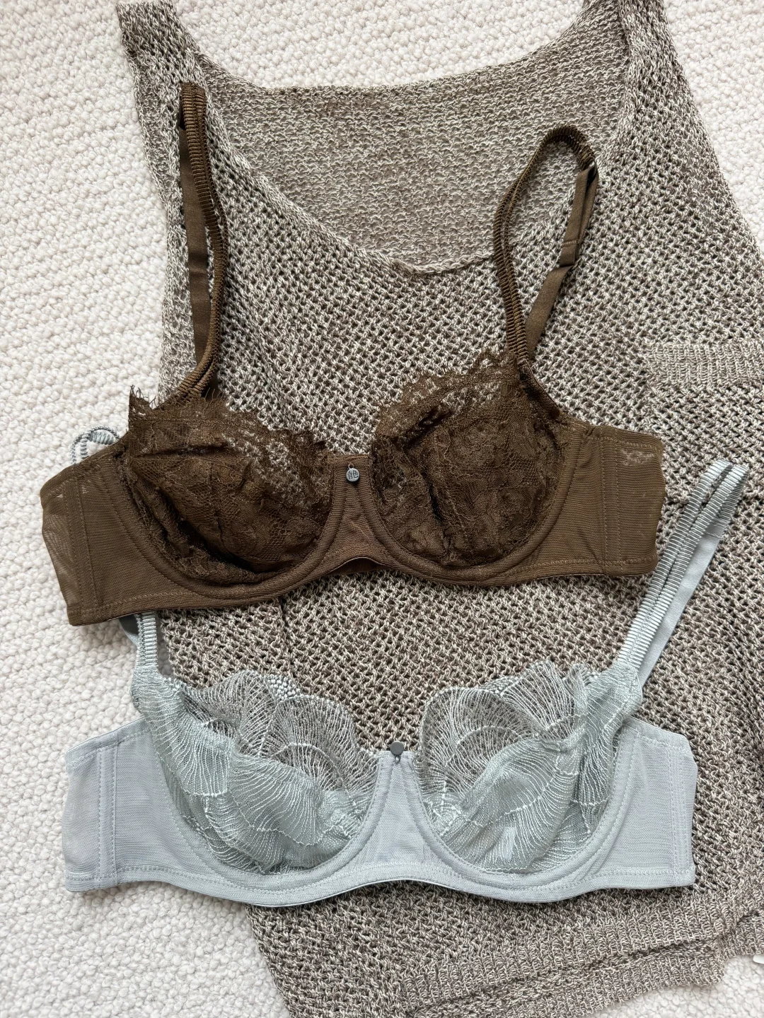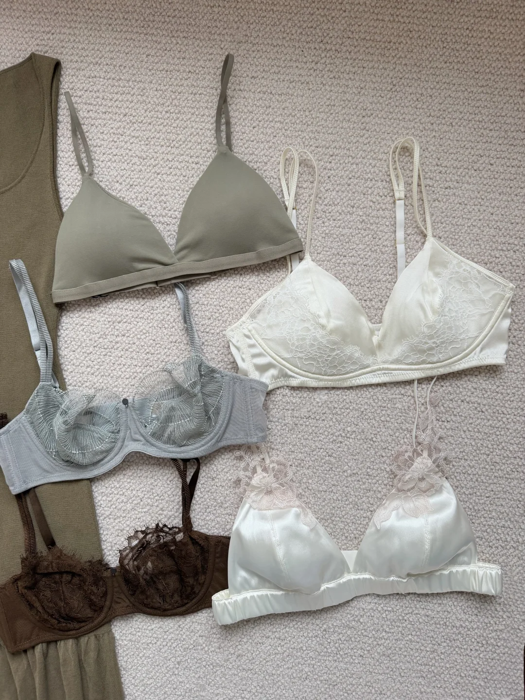 关于春夏的美丽小巧思✨ 🫧精致内衣外搭宽松透视感上衣 属于内衣外穿的时髦进阶版 灰绿色复古法式三角杯 色系和谐且统一 🪽又或是叠穿蕾丝或薄纱材质的拼接内衣 买了3种色系和款式 领口露出蕾丝边 柔美又精致 是那种不可忽略的精致点睛